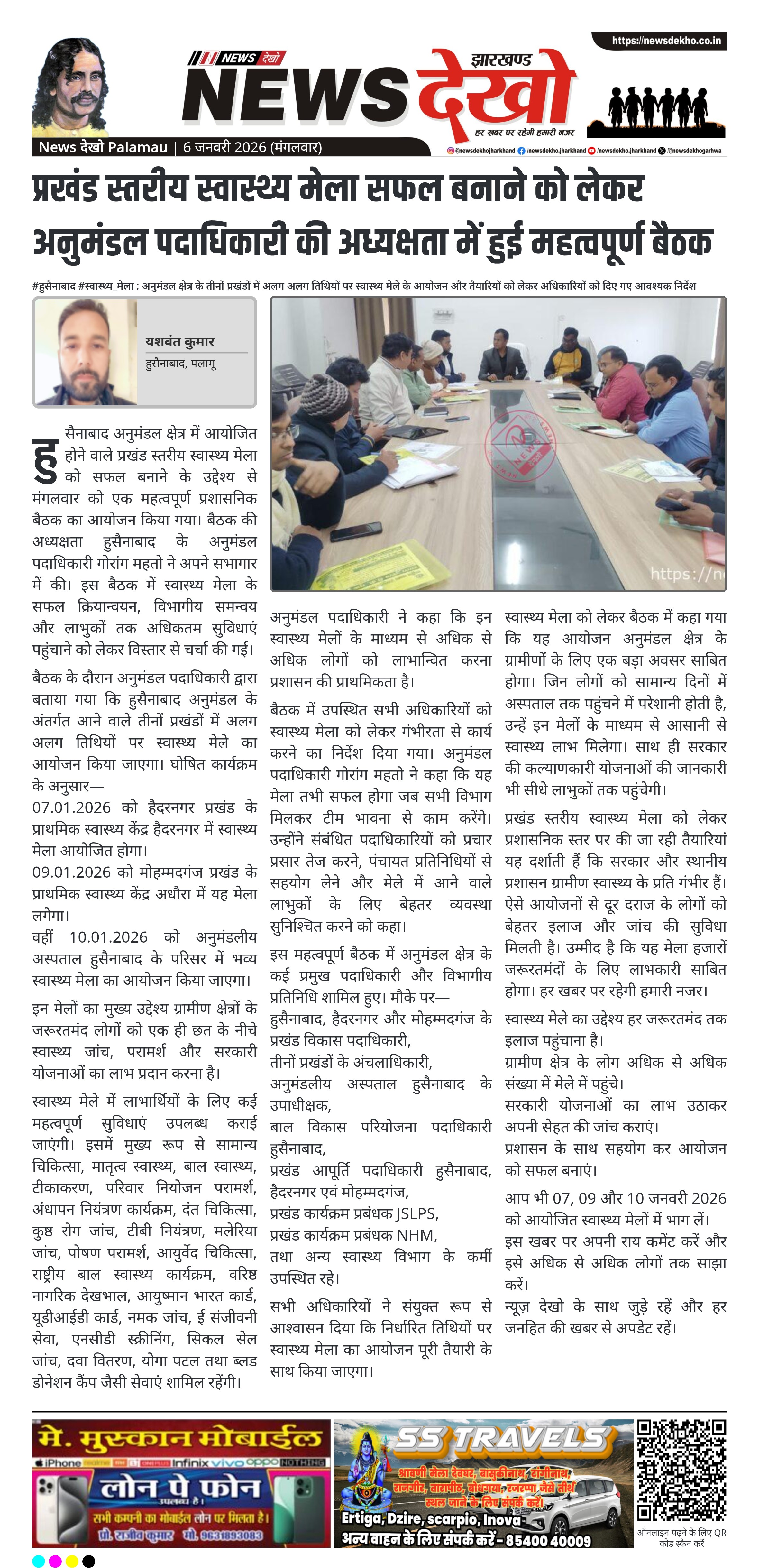 #हुसैनाबाद #स्वास्थ्य_मेला : अनुमंडल क्षेत्र के तीनों प्रखंडों में अलग अलग तिथियों पर स्वास्थ्य मेले के आयोजन और तैयारियों को लेकर अधिकारियों को दिए गए आवश्यक निर्देश स्वास्थ्य मेला आयोजन की तिथियां घोषित की गईं। 07 जनवरी 2026 को प्राथमिक स्वास्थ्य केंद्र हैदरनगर में मेला। 09 जनवरी 2026 को मोहम्मदगंज…