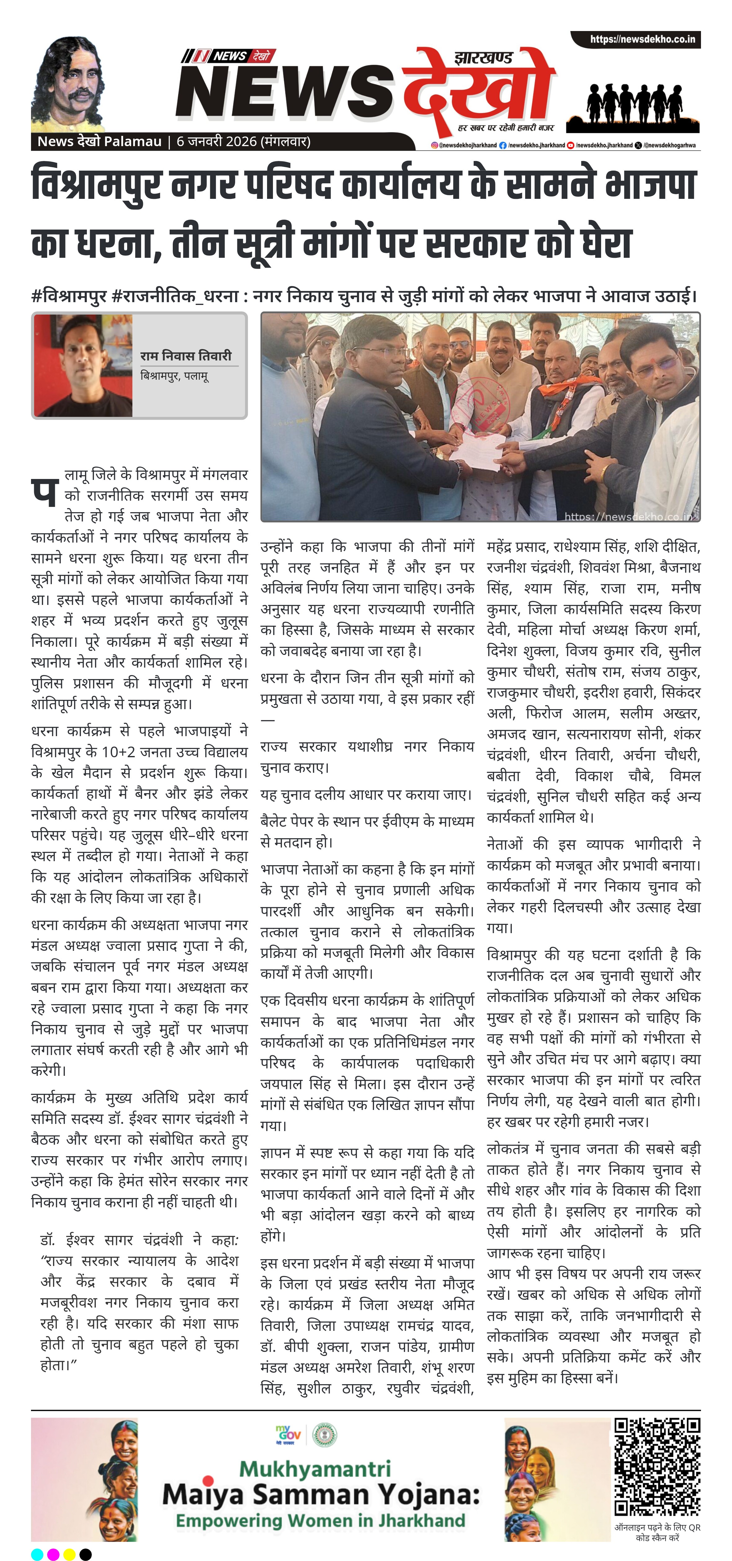 #विश्रामपुर #राजनीतिक_धरना : नगर निकाय चुनाव से जुड़ी मांगों को लेकर भाजपा ने आवाज उठाई। विश्रामपुर, पलामू के नगर परिषद कार्यालय के समक्ष एक दिवसीय धरना। धरना प्रदर्शन से पहले 10+2 जनता उच्च विद्यालय के खेल मैदान से जुलूस। अध्यक्षता भाजपा नगर मंडल अध्यक्ष ज्वाला प्रसाद गुप्ता ने की। संचालन…