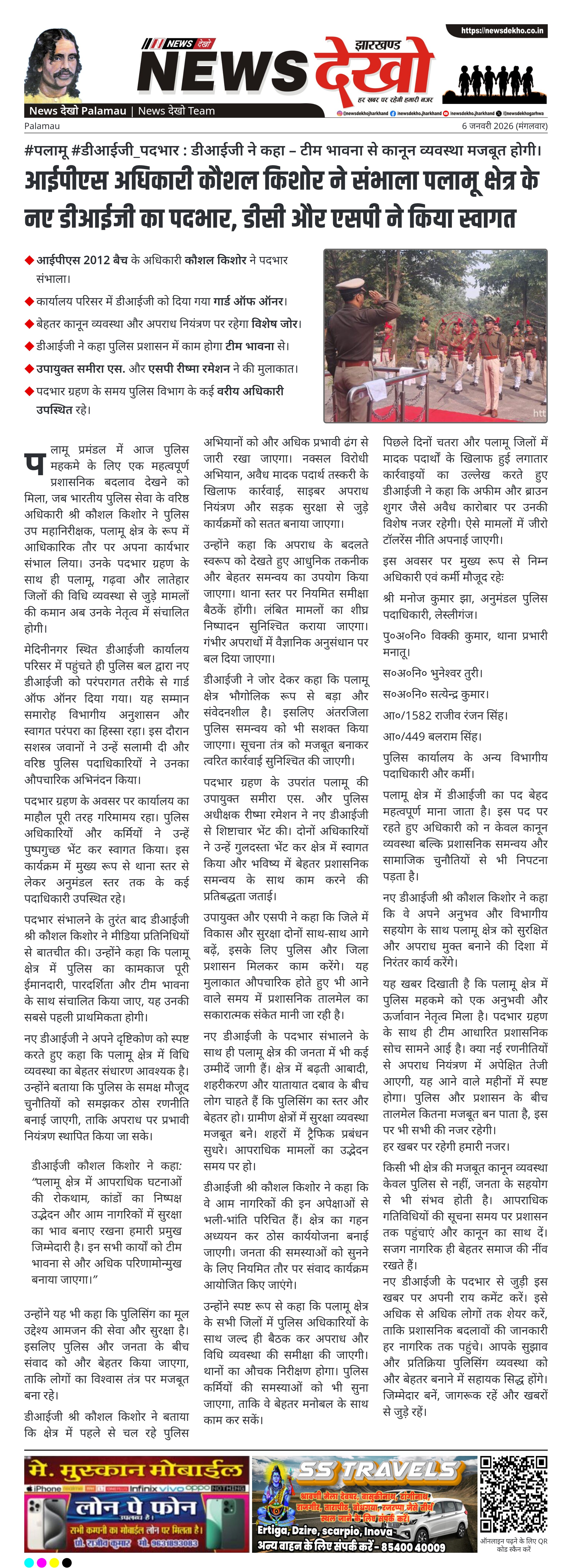 #पलामू #डीआईजी_पदभार : डीआईजी ने कहा – टीम भावना से कानून व्यवस्था मजबूत होगी। आईपीएस 2012 बैच के अधिकारी कौशल किशोर ने पदभार संभाला। कार्यालय परिसर में डीआईजी को दिया गया गार्ड ऑफ ऑनर। बेहतर कानून व्यवस्था और अपराध नियंत्रण पर रहेगा विशेष जोर। डीआईजी ने कहा पुलिस प्रशासन में…