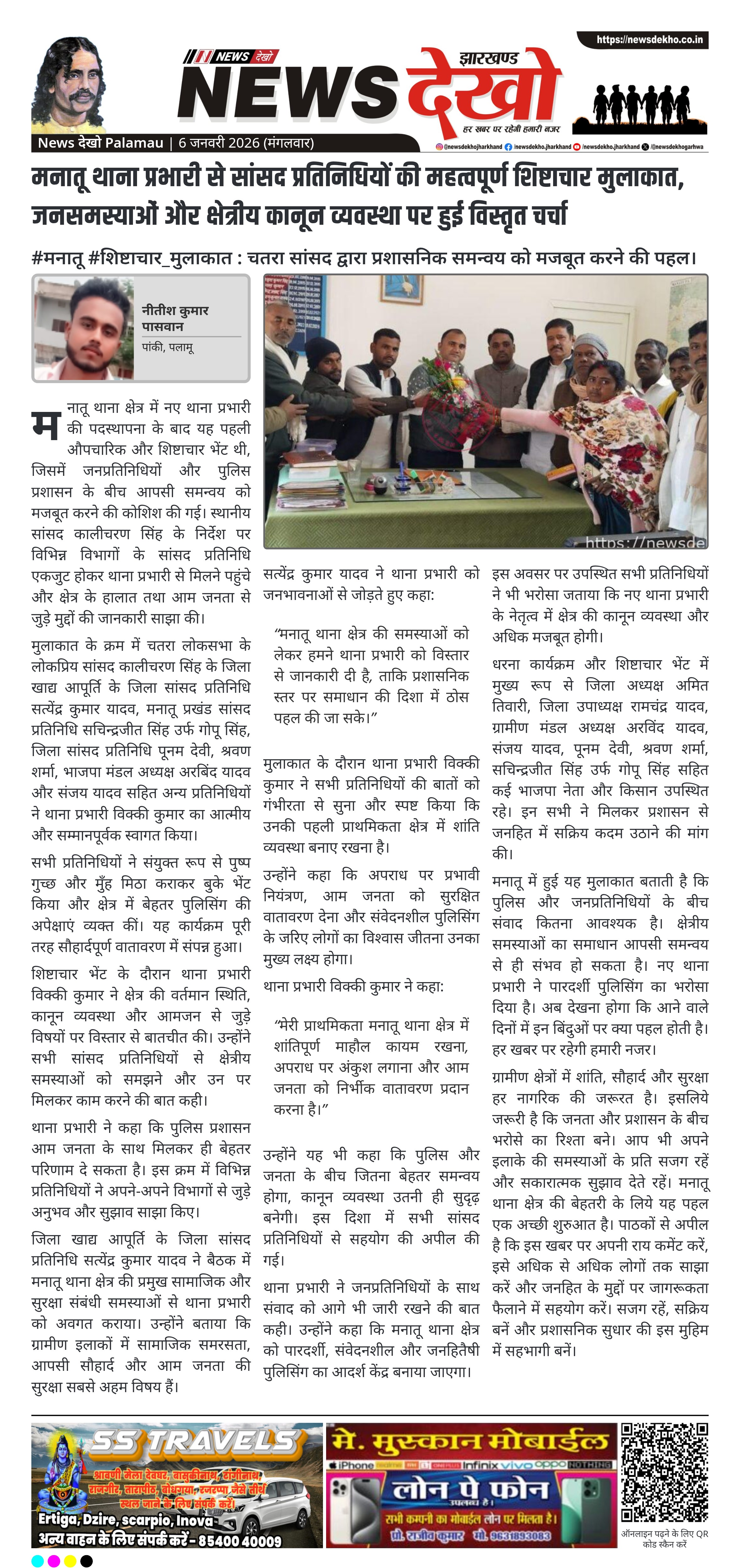 मनातू थाना प्रभारी से सांसद प्रतिनिधियों की महत्वपूर्ण शिष्टाचार मुलाकात, जनसमस्याओं और क्षेत्रीय कानून व्यवस्था पर हुई विस्तृत चर्चा