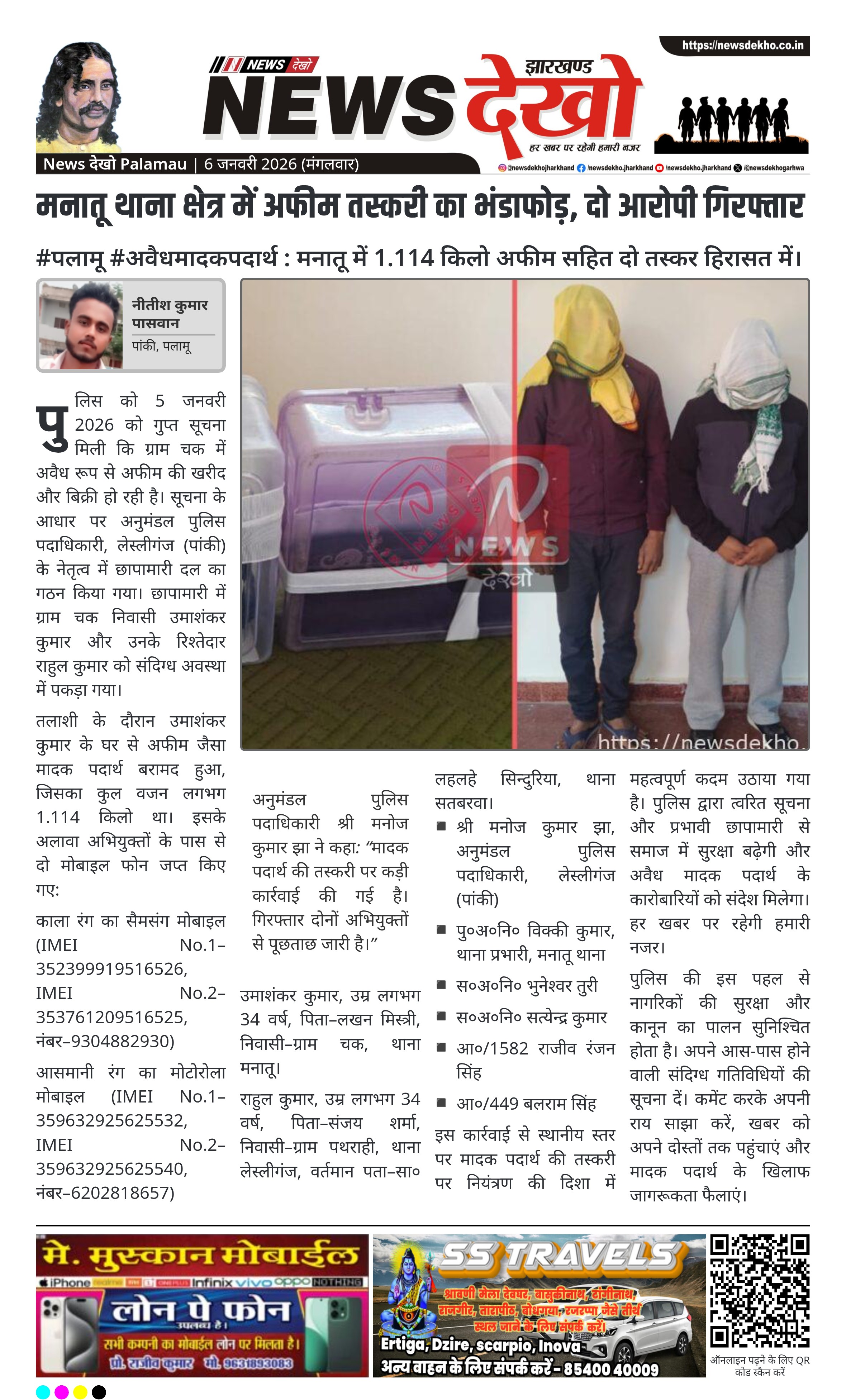 #पलामू #अवैधमादकपदार्थ : मनातू में 1.114 किलो अफीम सहित दो तस्कर हिरासत में। मनातू थाना क्षेत्र में 05 जनवरी 2026 को 1.114 किलो अफीम बरामद। गिरफ्तार अभियुक्त: उमाशंकर कुमार और राहुल कुमार, उम्र लगभग 34 वर्ष। बरामद मादक पदार्थ के साथ दो मोबाइल फोन भी जप्त किए गए। N.D.P.S. एक्ट,…