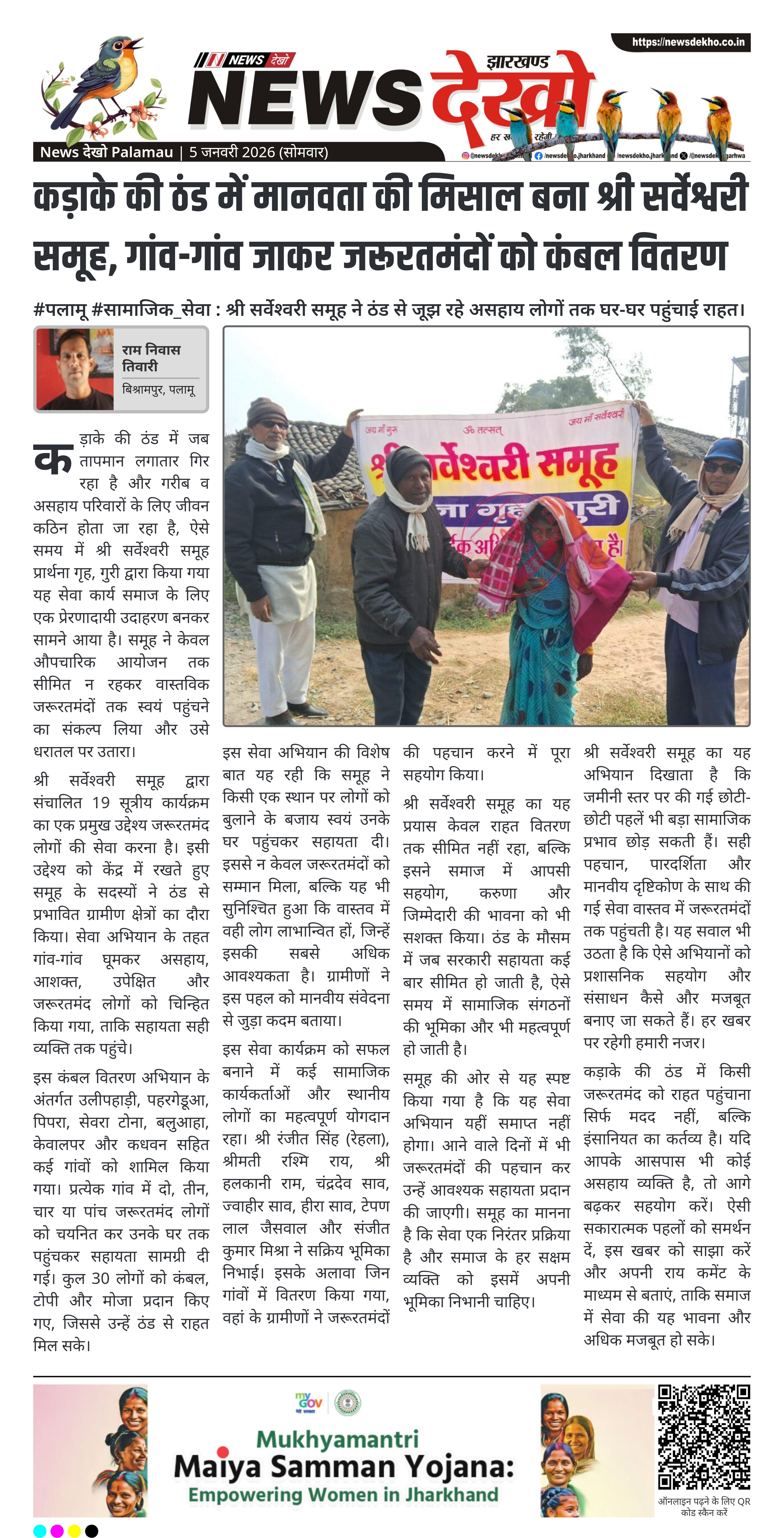 #पलामू #सामाजिक_सेवा : श्री सर्वेश्वरी समूह ने ठंड से जूझ रहे असहाय लोगों तक घर-घर पहुंचाई राहत। श्री सर्वेश्वरी समूह प्रार्थना गृह, गुरी द्वारा कंबल वितरण अभियान। उलीपहाड़ी, पहरगेडूआ, पिपरा, सेवरा टोना, बलुआहा सहित कई गांव शामिल। 30 जरूरतमंद लोगों को टोपी, मोजा और कंबल वितरित। 19 सूत्रीय सेवा कार्यक्रम…
