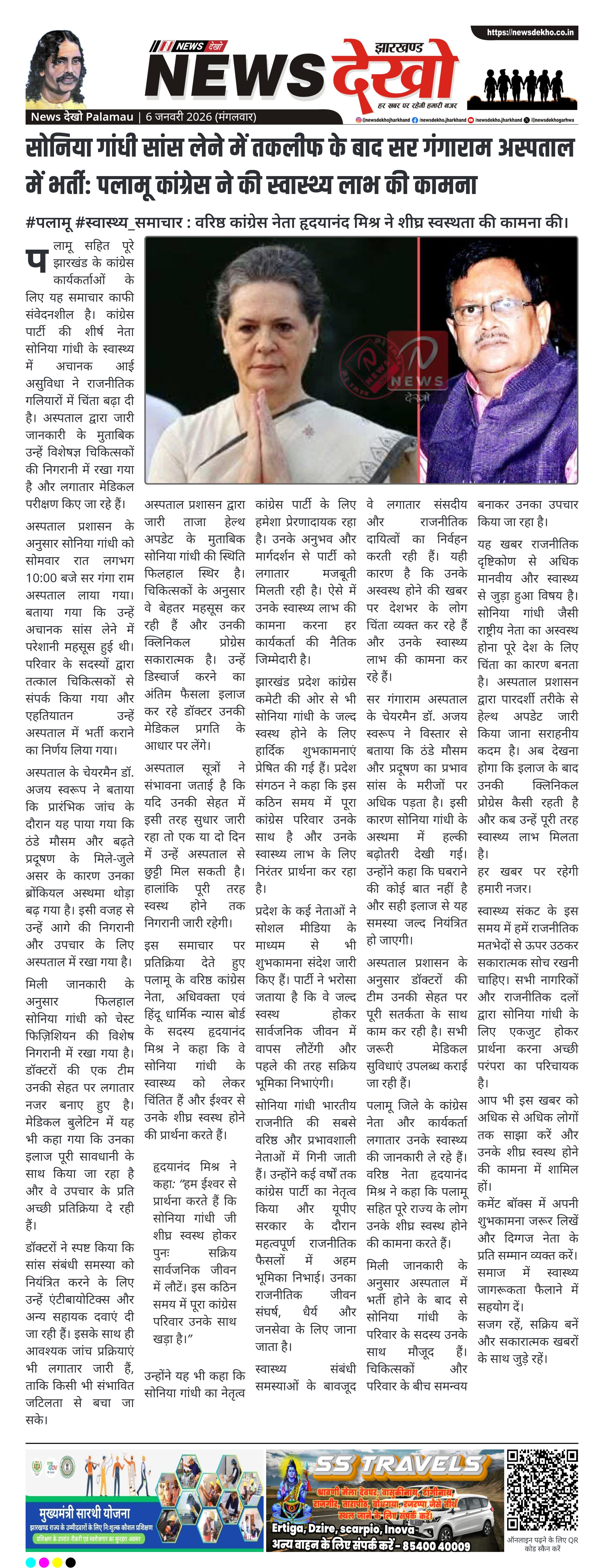 #पलामू #स्वास्थ्य_समाचार : वरिष्ठ कांग्रेस नेता हृदयानंद मिश्र ने शीघ्र स्वस्थता की कामना की। वरिष्ठ कांग्रेस नेता हृदयानंद मिश्र ने सोनिया गांधी के स्वास्थ्य को लेकर चिंता जताई। सोमवार रात करीब 10:00 बजे उन्हें सर गंगाराम अस्पताल में कराया गया भर्ती। अस्पताल के चेयरमैन डॉ. अजय स्वरूप ने जारी किया…