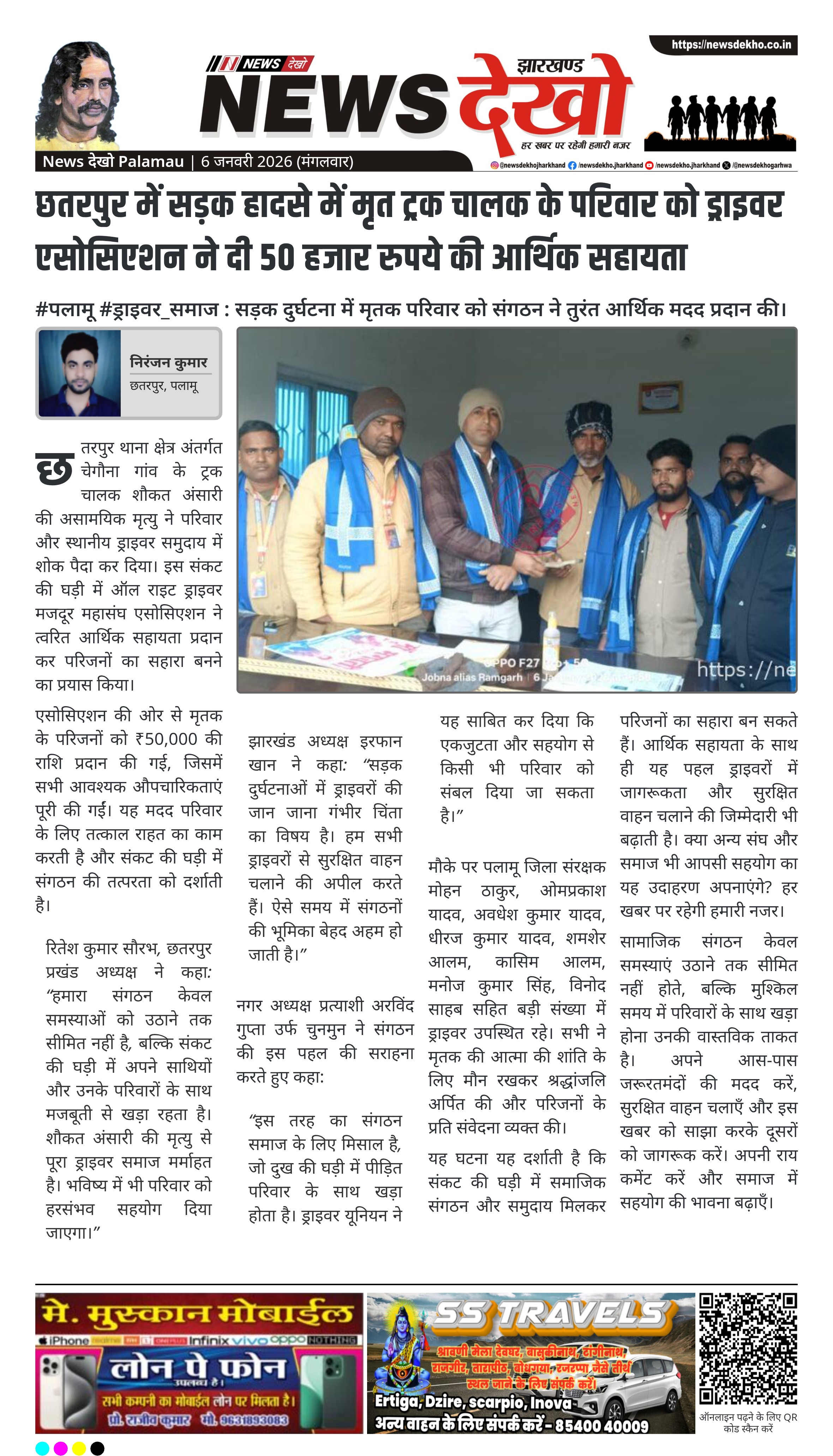 #पलामू #ड्राइवर_समाज : सड़क दुर्घटना में मृतक परिवार को संगठन ने तुरंत आर्थिक मदद प्रदान की। सड़क हादसे में 21 वर्षीय ट्रक चालक शौकत अंसारी की मृत्यु हुई। ऑल राइट ड्राइवर मजदूर महासंघ एसोसिएशन, छतरपुर–पलामू ने परिवार को ₹50,000 सहायता दी। एसोसिएशन के छतरपुर प्रखंड अध्यक्ष रितेश कुमार सौरभ ने…