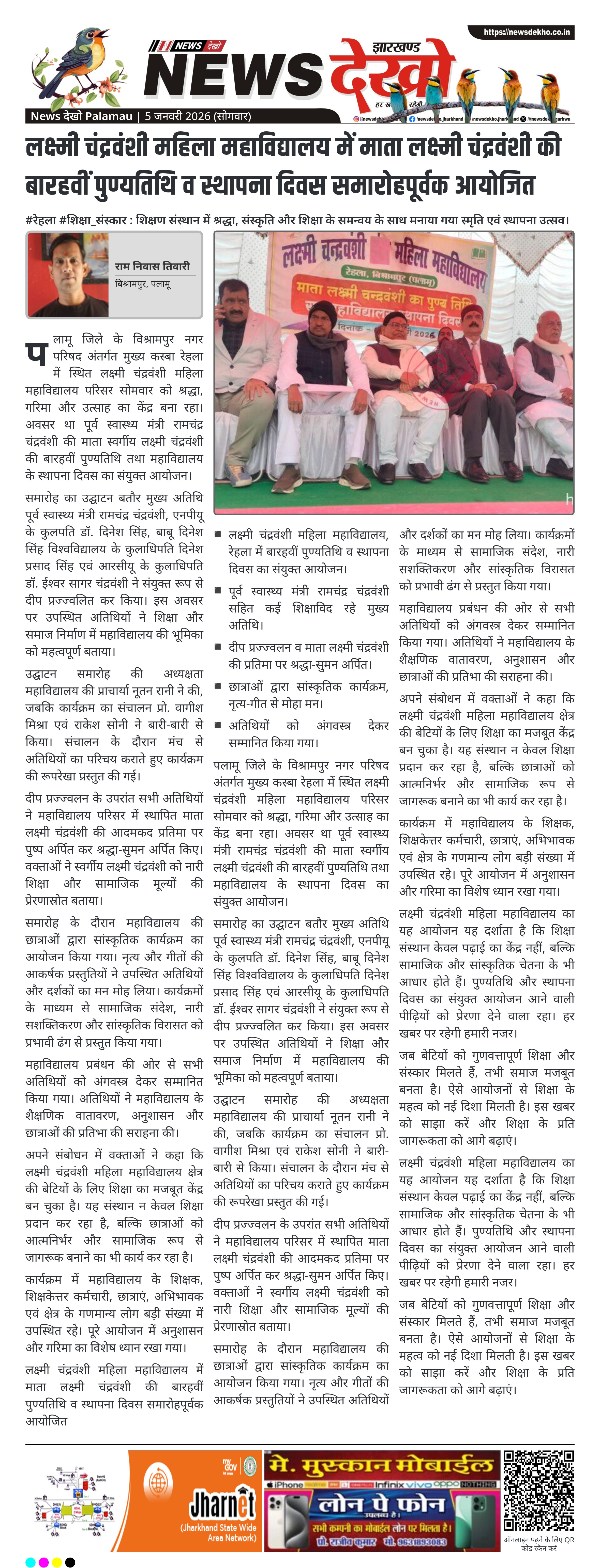 #रेहला #शिक्षा_संस्कार : शिक्षण संस्थान में श्रद्धा, संस्कृति और शिक्षा के समन्वय के साथ मनाया गया स्मृति एवं स्थापना उत्सव। लक्ष्मी चंद्रवंशी महिला महाविद्यालय, रेहला में बारहवीं पुण्यतिथि व स्थापना दिवस का संयुक्त आयोजन। पूर्व स्वास्थ्य मंत्री रामचंद्र चंद्रवंशी सहित कई शिक्षाविद रहे मुख्य अतिथि। दीप प्रज्ज्वलन व माता लक्ष्मी…