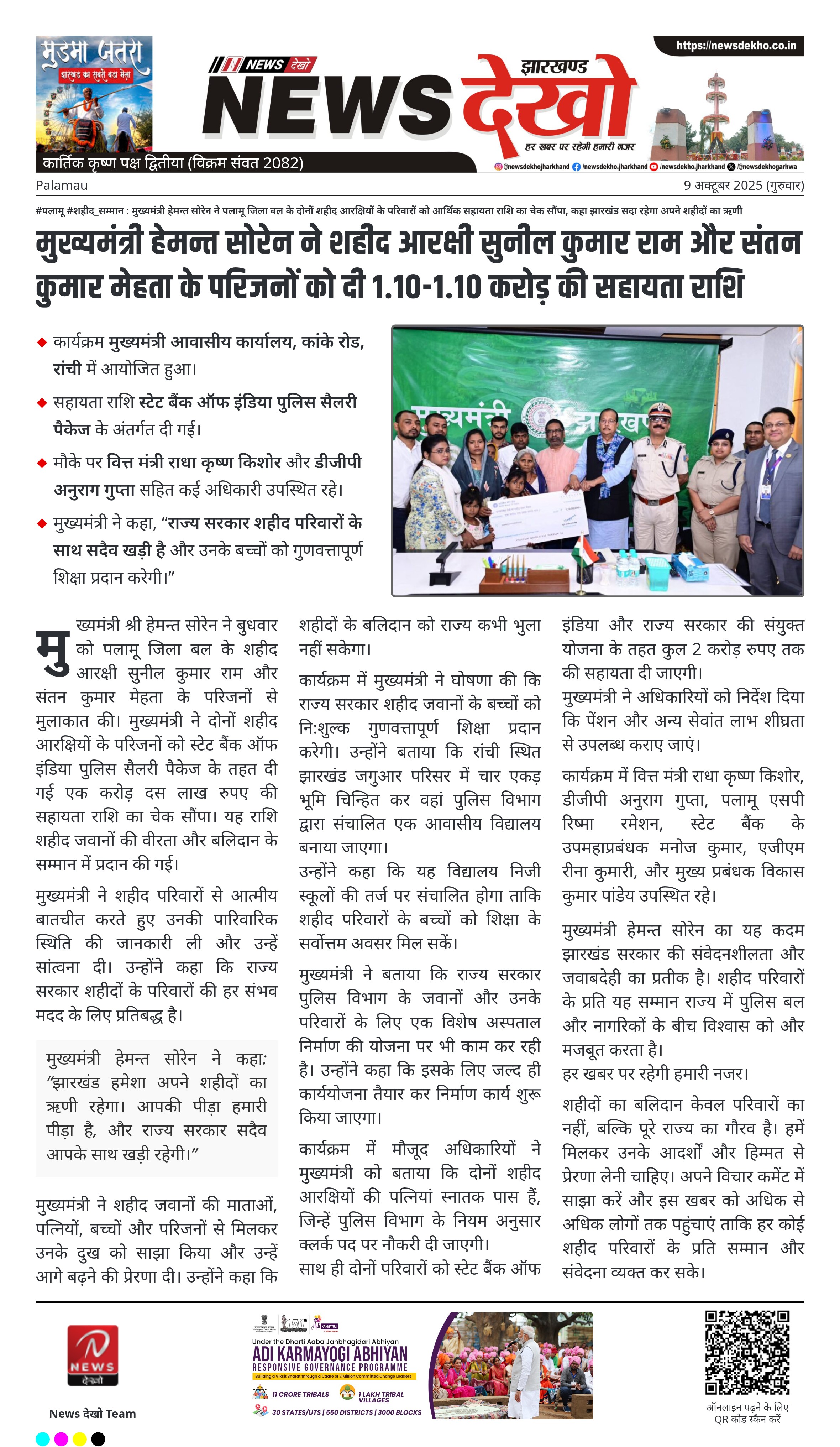 मुख्यमंत्री हेमन्त सोरेन ने शहीद आरक्षी सुनील कुमार राम और संतन कुमार मेहता के परिजनों को दी 1.10-1.10 करोड़ की सहायता राशि
