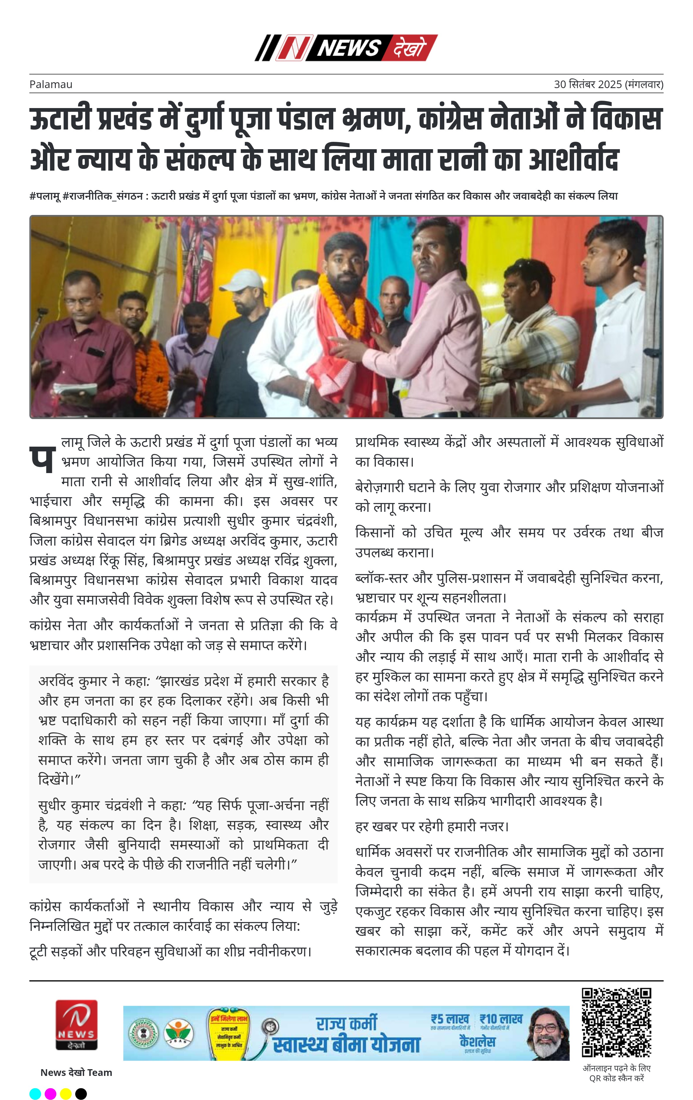 #पलामू #राजनीतिक_संगठन : ऊटारी प्रखंड में दुर्गा पूजा पंडालों का भ्रमण, कांग्रेस नेताओं ने जनता संगठित कर विकास और जवाबदेही का संकल्प लिया ऊटारी प्रखंड के दुर्गा पूजा पंडालों का भ्रमण किया गया और माता रानी से आशीर्वाद लिया गया। कार्यक्रम में बिश्रामपुर विधानसभा कांग्रेस प्रत्याशी सुधीर कुमार चंद्रवंशी, जिला…