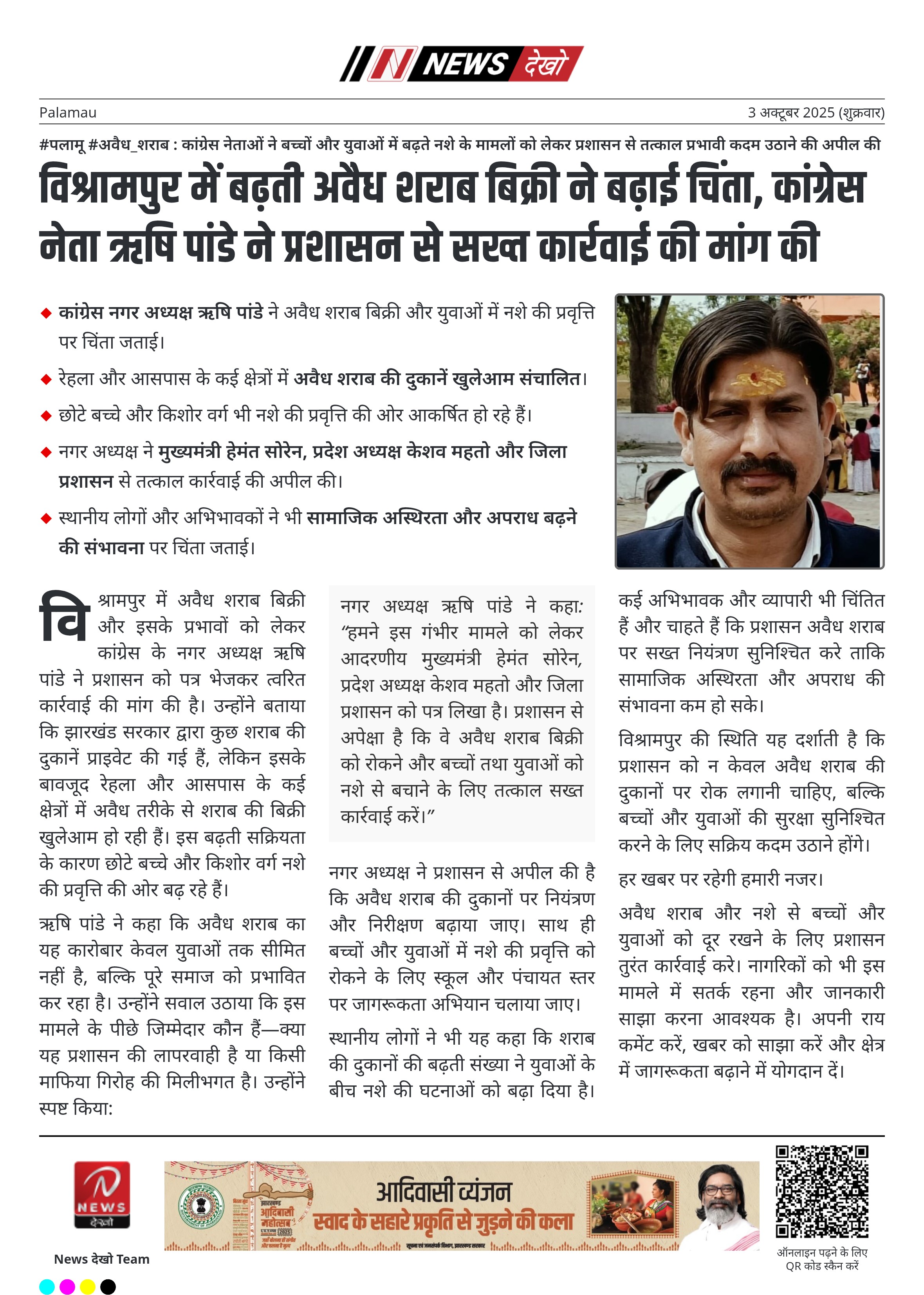 #पलामू #अवैध_शराब : कांग्रेस नेताओं ने बच्चों और युवाओं में बढ़ते नशे के मामलों को लेकर प्रशासन से तत्काल प्रभावी कदम उठाने की अपील की कांग्रेस नगर अध्यक्ष ऋषि पांडे ने अवैध शराब बिक्री और युवाओं में नशे की प्रवृत्ति पर चिंता जताई। रेहला और आसपास के कई क्षेत्रों में…