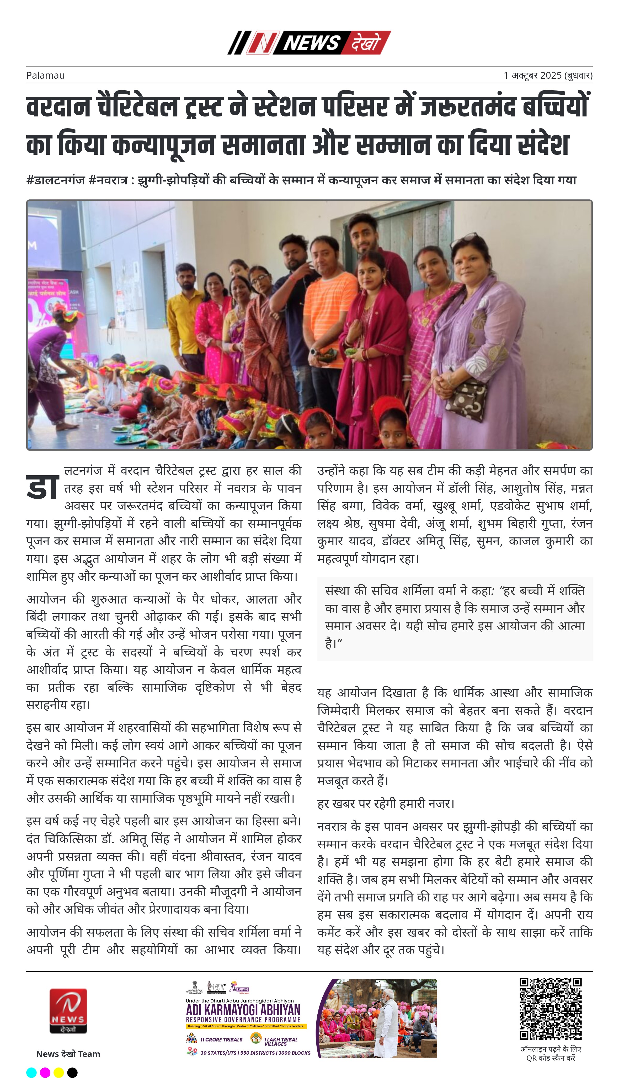 #डालटनगंज #नवरात्र : झुग्गी-झोपड़ियों की बच्चियों के सम्मान में कन्यापूजन कर समाज में समानता का संदेश दिया गया वरदान चैरिटेबल ट्रस्ट डालटनगंज ने हर साल की तरह इस बार भी किया कन्यापूजन। स्टेशन परिसर में झुग्गी-झोपड़ी की बच्चियों का सम्मानपूर्वक पूजन। आलता, बिंदी, चुनरी, आरती और भोजन के साथ संपन्न…