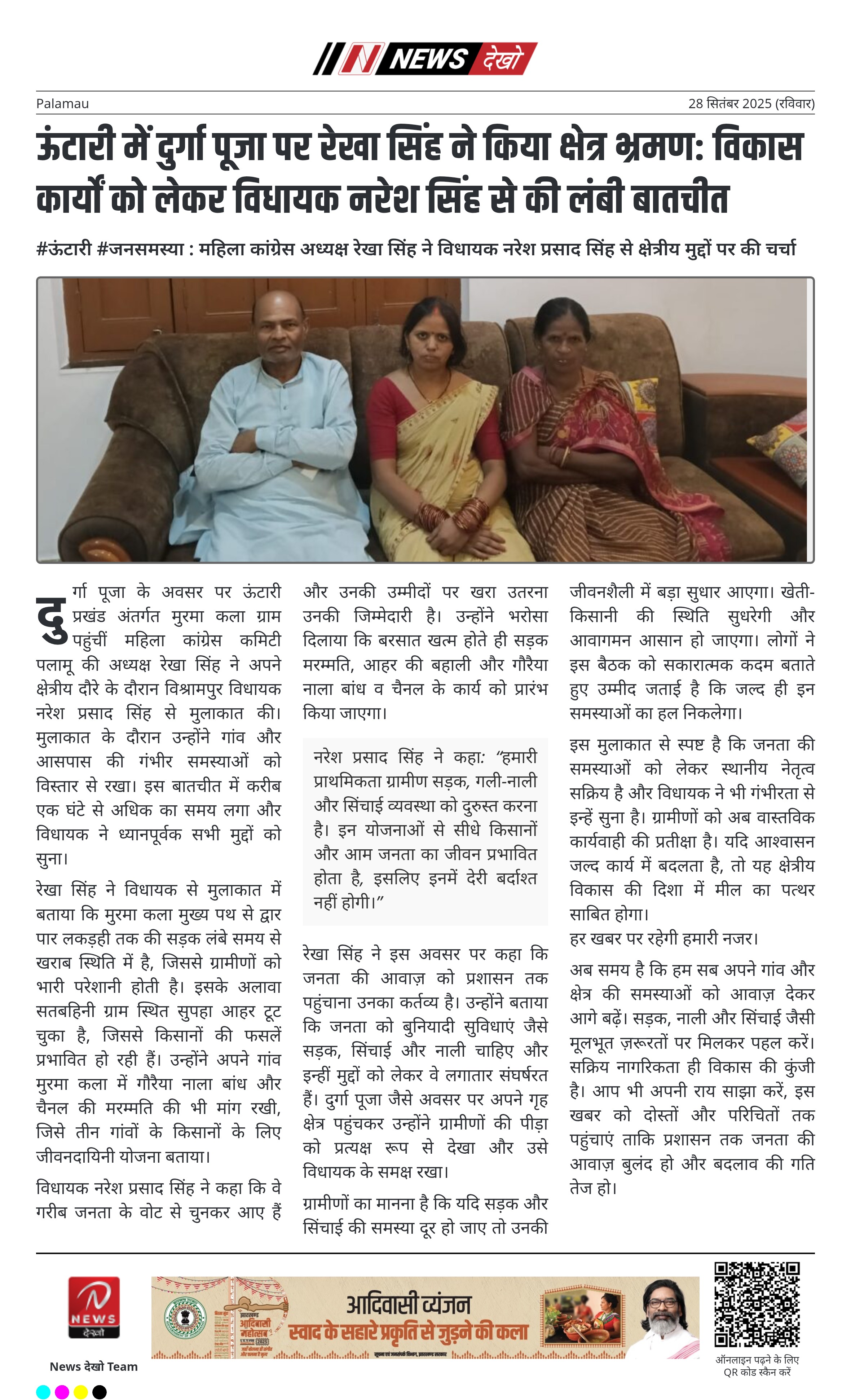 #ऊंटारी #जनसमस्या : महिला कांग्रेस अध्यक्ष रेखा सिंह ने विधायक नरेश प्रसाद सिंह से क्षेत्रीय मुद्दों पर की चर्चा रेखा सिंह, अध्यक्ष महिला कांग्रेस कमिटी पलामू दुर्गा पूजा पर अपने गांव मुरमा कला पहुंचीं। विश्रामपुर विधायक नरेश प्रसाद सिंह से मुलाकात कर विकास कार्यों पर रखी बात। सड़क, आहर, गौरैया…