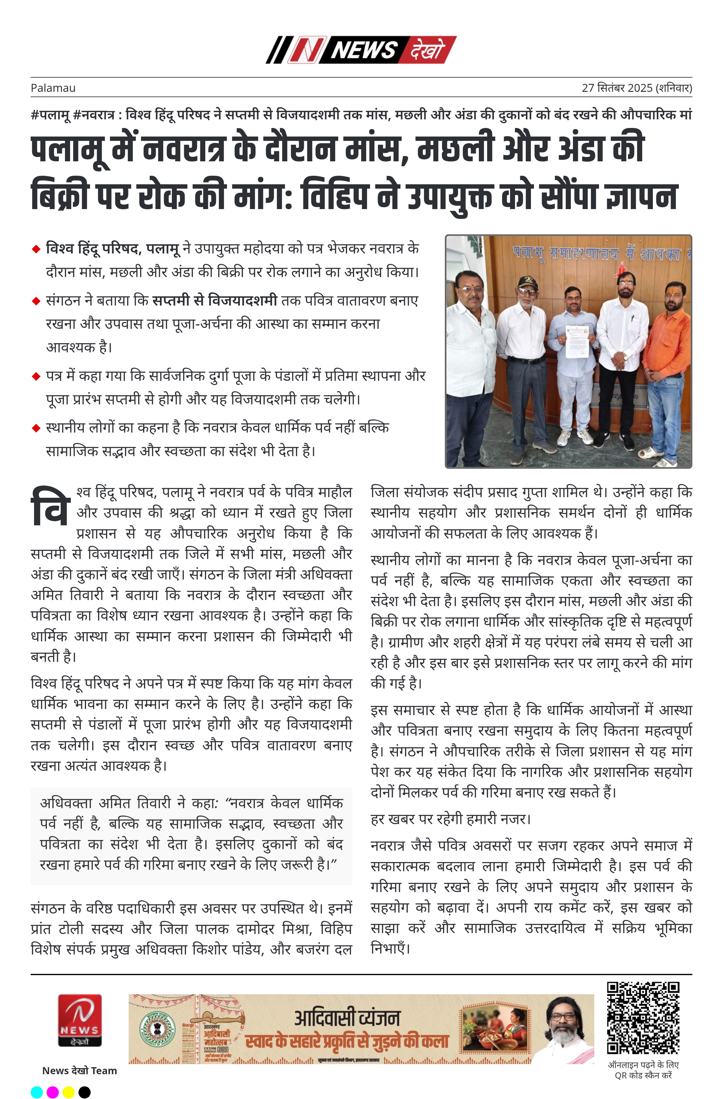 पलामू में नवरात्र के दौरान मांस, मछली और अंडा की बिक्री पर रोक की मांग: विहिप ने उपायुक्त को सौंपा ज्ञापन