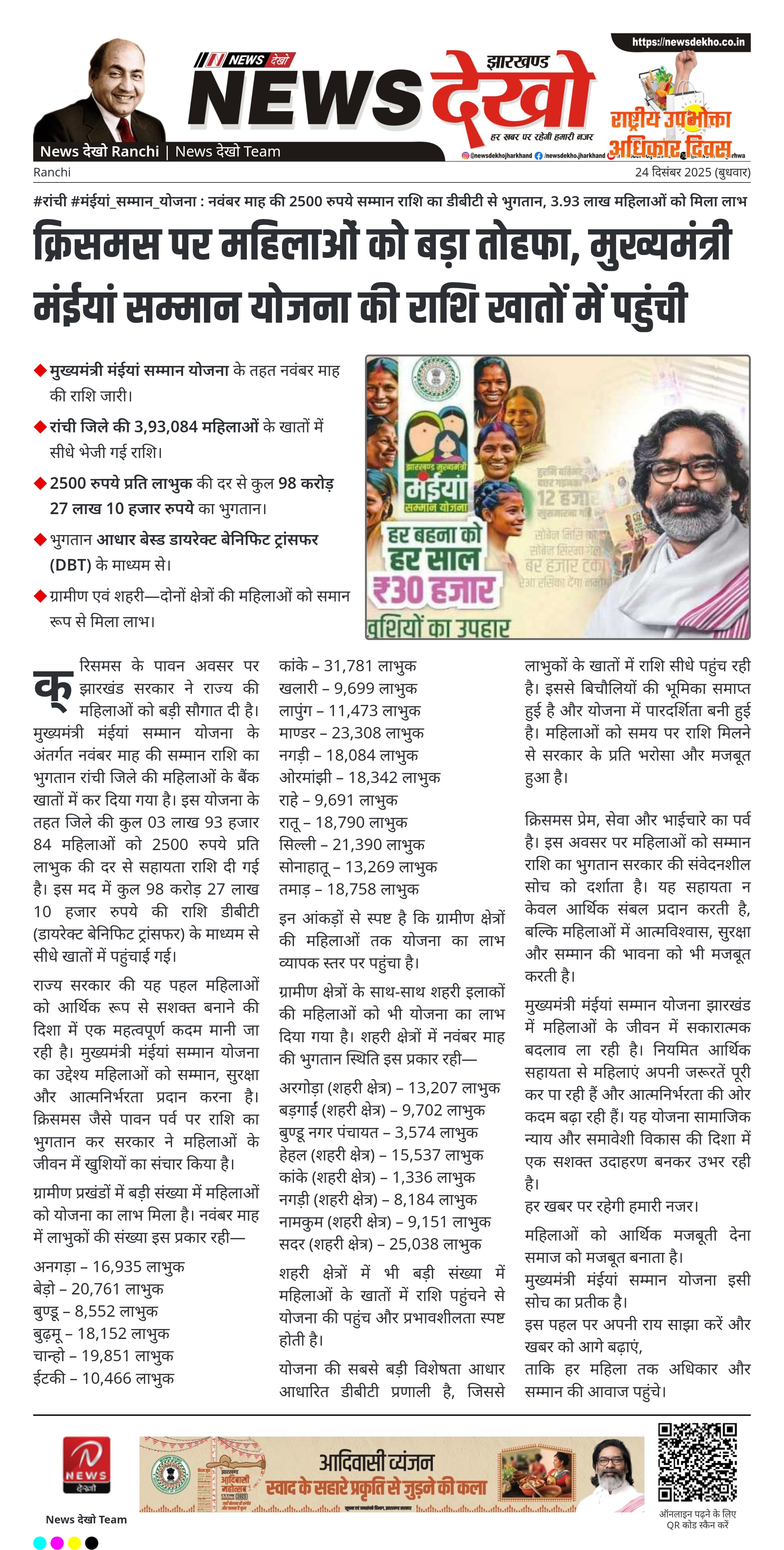 क्रिसमस पर महिलाओं को बड़ा तोहफा, मुख्यमंत्री मंईयां सम्मान योजना की राशि खातों में पहुंची