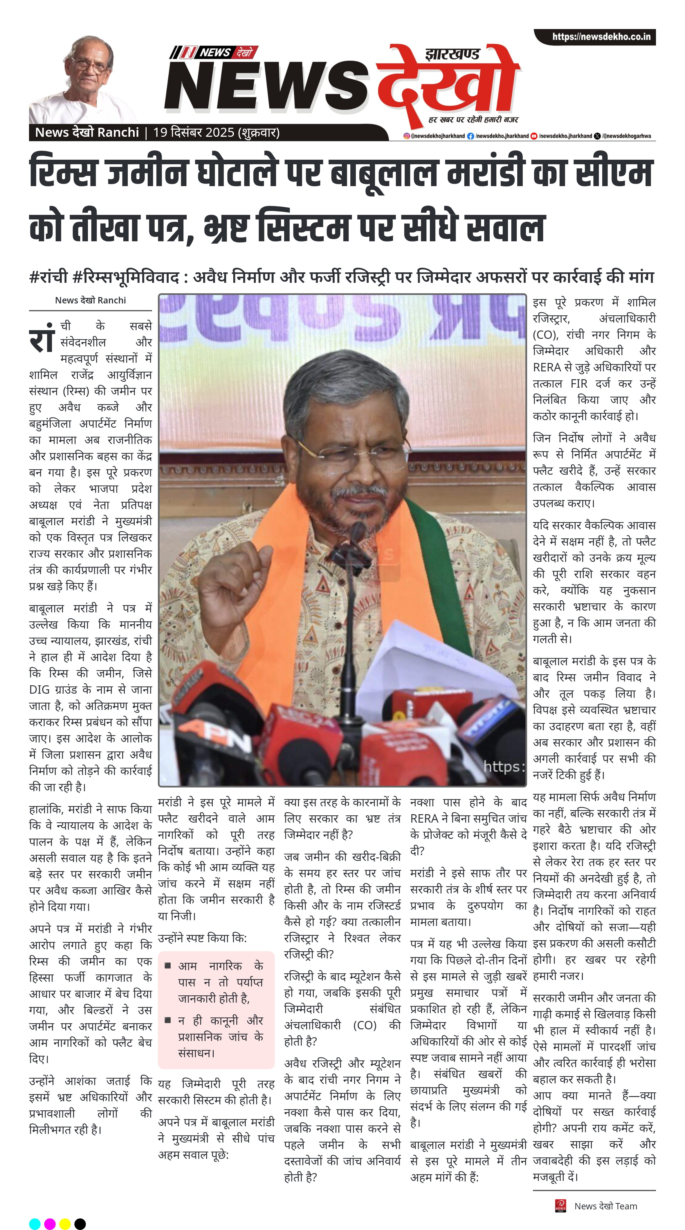 रिम्स जमीन घोटाले पर बाबूलाल मरांडी का सीएम को तीखा पत्र, भ्रष्ट सिस्टम पर सीधे सवाल