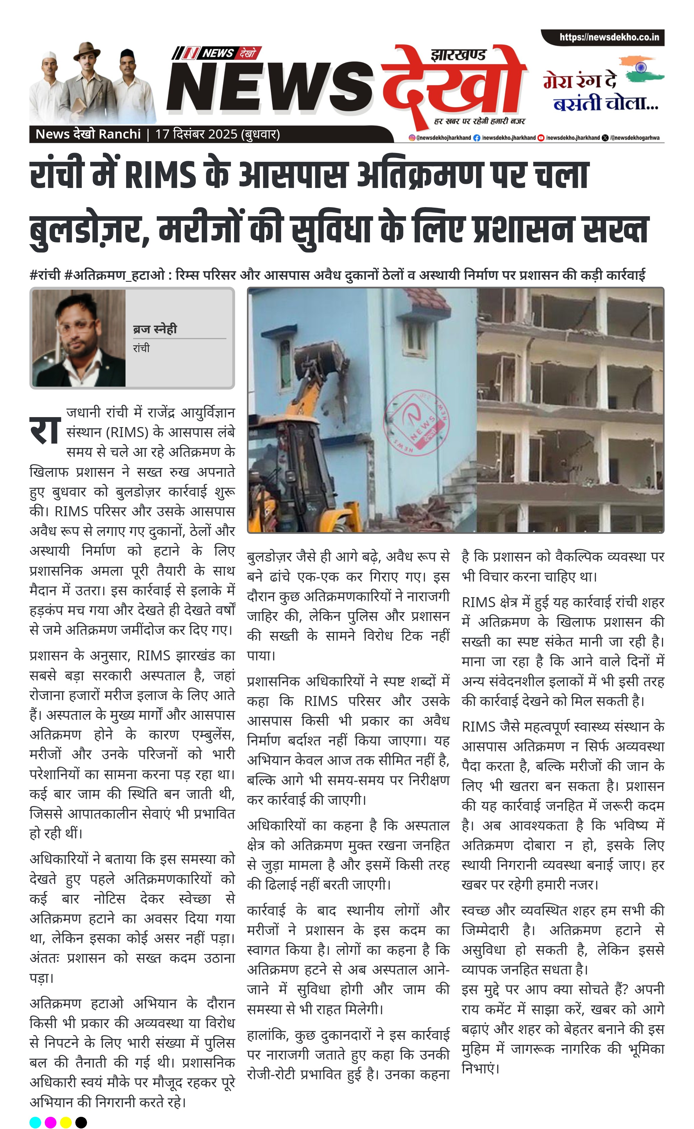 #रांची #अतिक्रमण_हटाओ : रिम्स परिसर और आसपास अवैध दुकानों ठेलों व अस्थायी निर्माण पर प्रशासन की कड़ी कार्रवाई राजेंद्र आयुर्विज्ञान संस्थान (RIMS) परिसर और आसपास बड़े पैमाने पर अतिक्रमण हटाया गया। दुकान, ठेले और अस्थायी निर्माण बुलडोज़र से ध्वस्त किए गए। अतिक्रमण के कारण मरीजों और एंबुलेंस की आवाजाही में…
