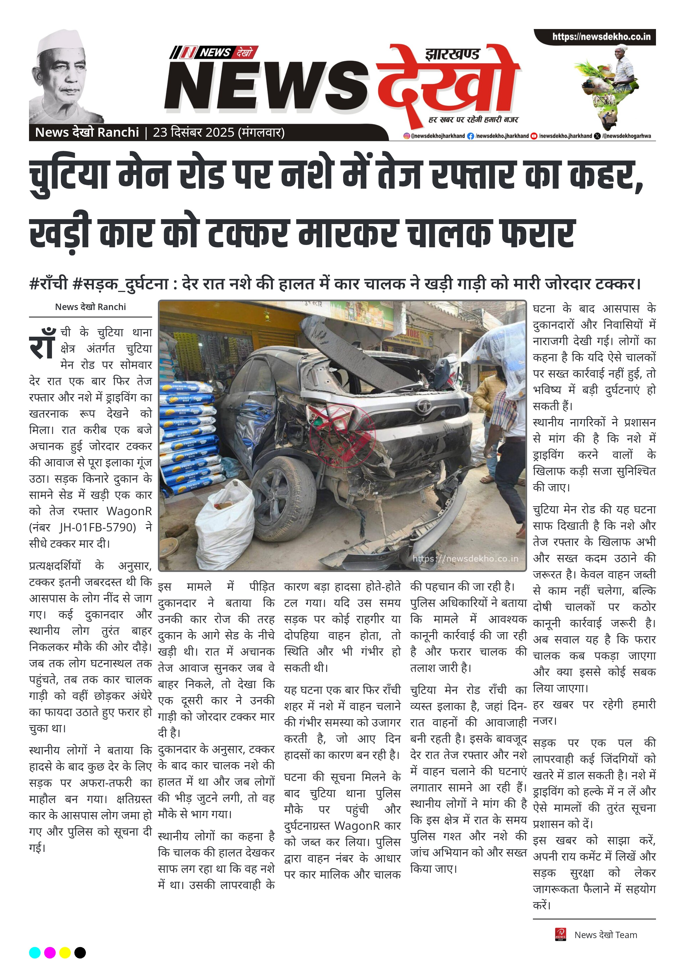 चुटिया मेन रोड पर नशे में तेज रफ्तार का कहर, खड़ी कार को टक्कर मारकर चालक फरार