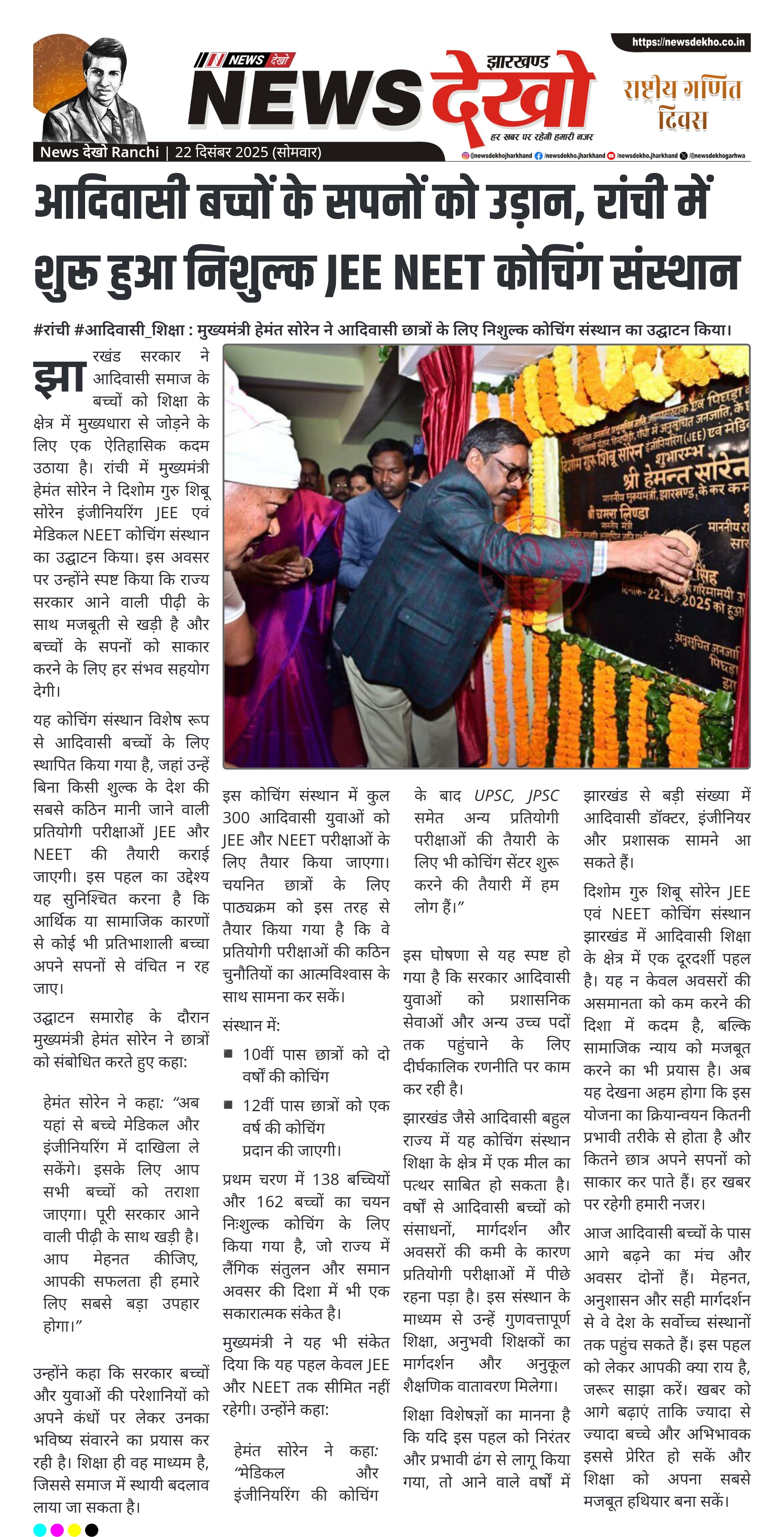 #रांची #आदिवासी_शिक्षा : मुख्यमंत्री हेमंत सोरेन ने आदिवासी छात्रों के लिए निशुल्क कोचिंग संस्थान का उद्घाटन किया। मुख्यमंत्री हेमंत सोरेन ने रांची में कोचिंग संस्थान का उद्घाटन किया। आदिवासी बच्चों को JEE और NEET की निःशुल्क कोचिंग दी जाएगी। संस्थान में 300 युवाओं को प्रतियोगी परीक्षाओं के लिए तैयार किया…