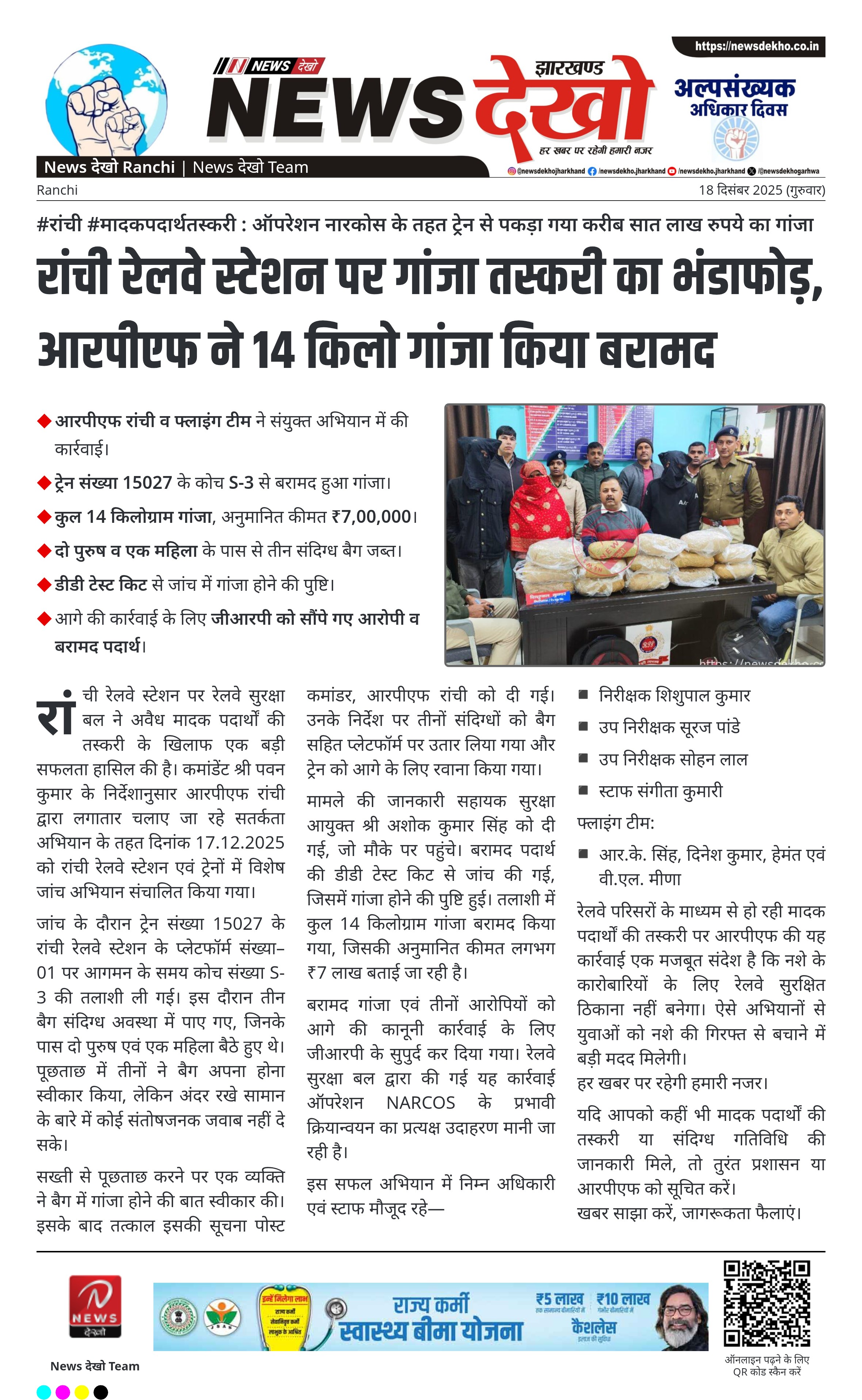 #रांची #मादकपदार्थतस्करी : ऑपरेशन नारकोस के तहत ट्रेन से पकड़ा गया करीब सात लाख रुपये का गांजा आरपीएफ रांची व फ्लाइंग टीम ने संयुक्त अभियान में की कार्रवाई। ट्रेन संख्या 15027 के कोच S-3 से बरामद हुआ गांजा। कुल 14 किलोग्राम गांजा, अनुमानित कीमत ₹7,00,000। दो पुरुष व एक महिला…