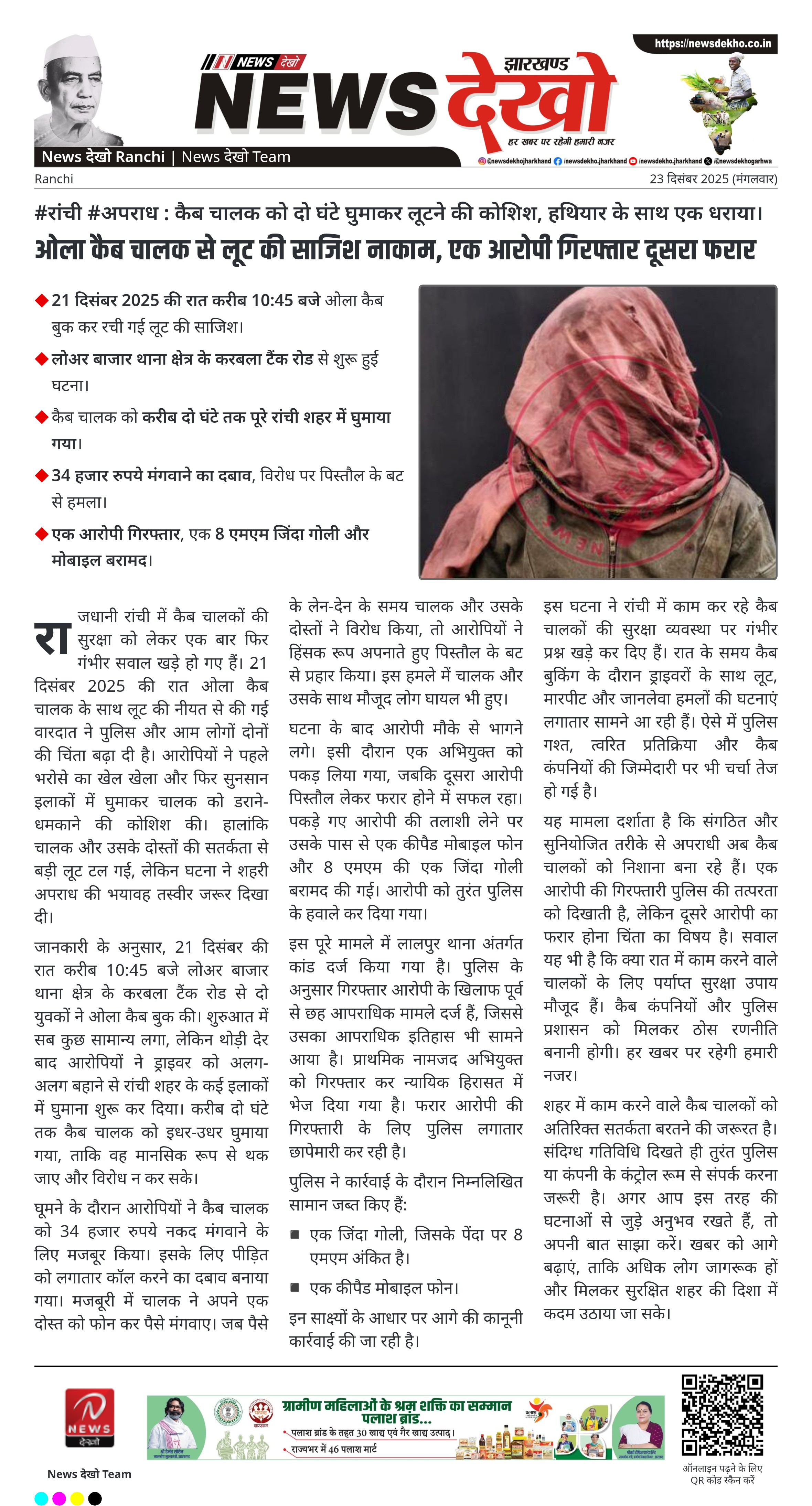 #रांची #अपराध : कैब चालक को दो घंटे घुमाकर लूटने की कोशिश, हथियार के साथ एक धराया। 21 दिसंबर 2025 की रात करीब 10:45 बजे ओला कैब बुक कर रची गई लूट की साजिश। लोअर बाजार थाना क्षेत्र के करबला टैंक रोड से शुरू हुई घटना। कैब चालक को करीब…