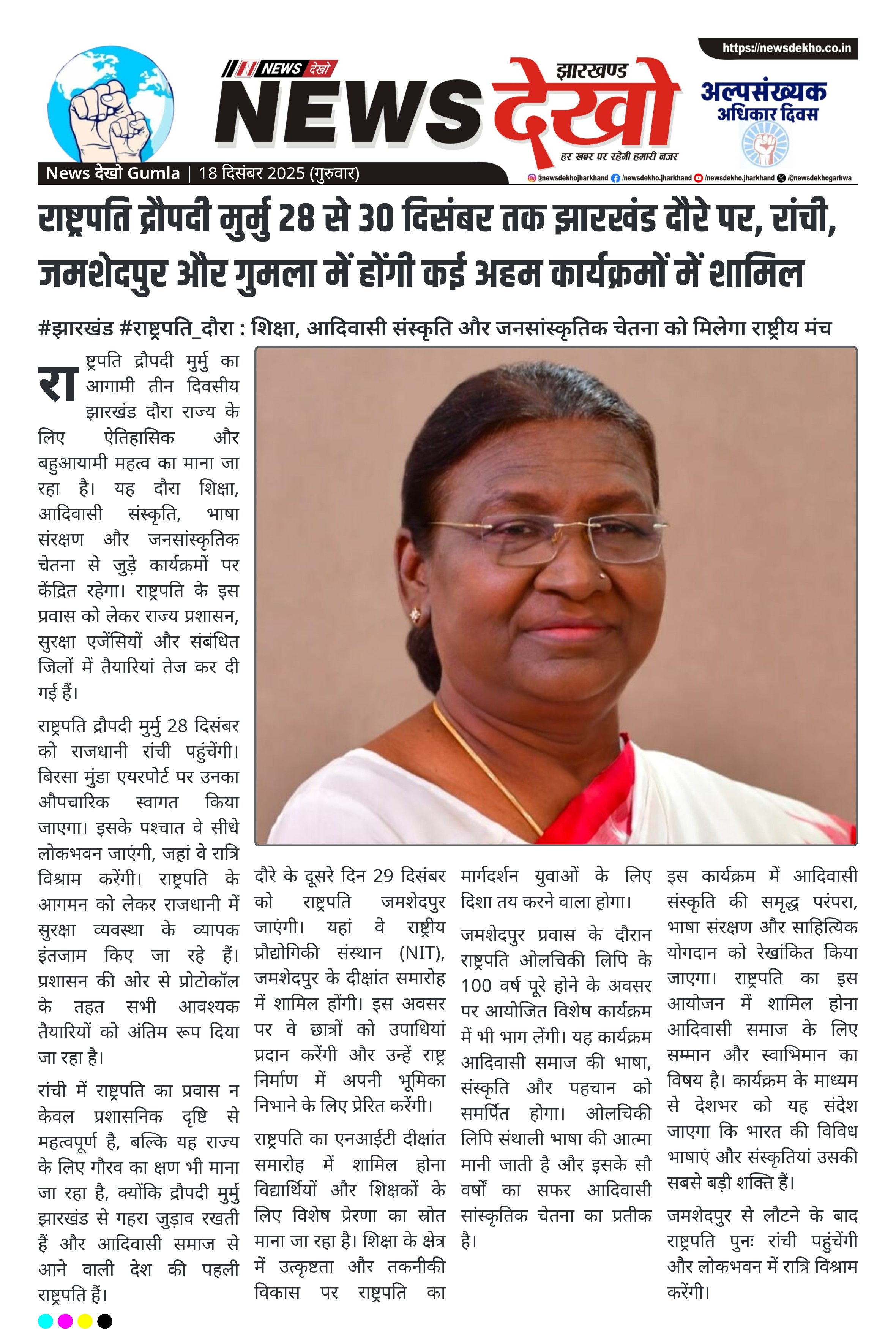 #झारखंड #राष्ट्रपति_दौरा : शिक्षा, आदिवासी संस्कृति और जनसांस्कृतिक चेतना को मिलेगा राष्ट्रीय मंच राष्ट्रपति द्रौपदी मुर्मु 28 दिसंबर से तीन दिवसीय झारखंड दौरे पर रहेंगी। 28 दिसंबर को राष्ट्रपति का रांची आगमन, लोकभवन में रात्रि विश्राम। 29 दिसंबर को जमशेदपुर में एनआईटी दीक्षांत समारोह में होंगी शामिल। ओलचिकी लिपि के…