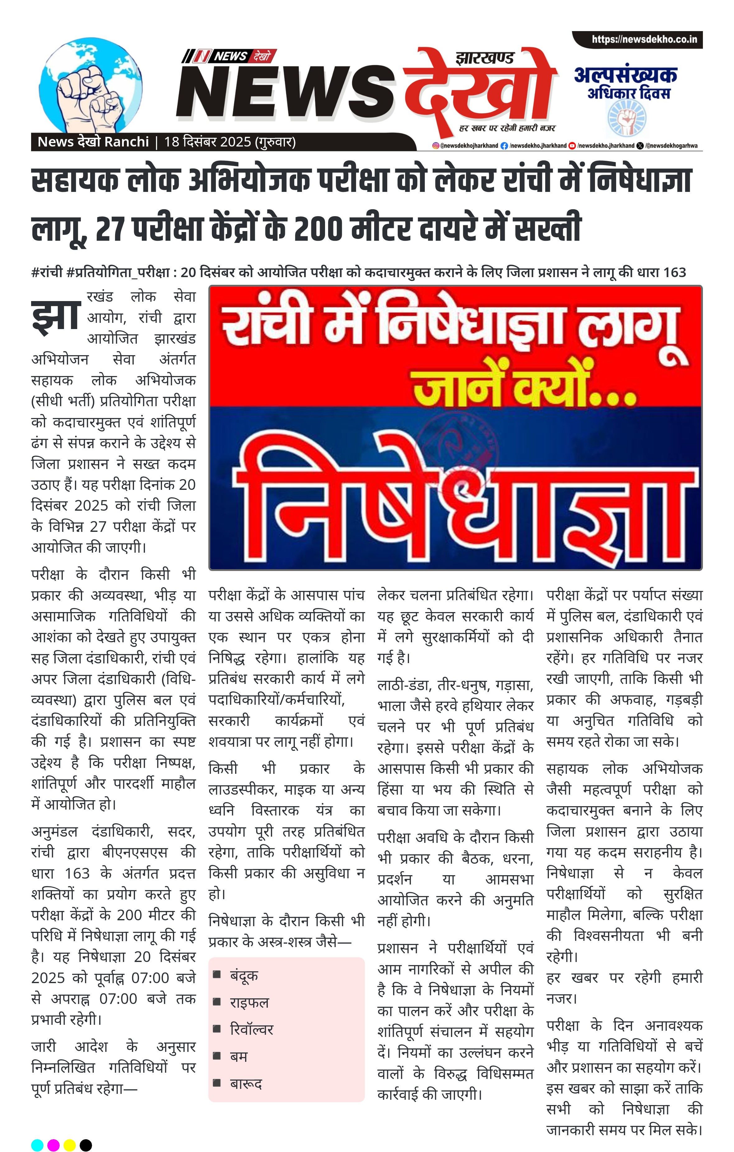 #रांची #प्रतियोगिता_परीक्षा : 20 दिसंबर को आयोजित परीक्षा को कदाचारमुक्त कराने के लिए जिला प्रशासन ने लागू की धारा 163 झारखंड लोक सेवा आयोग द्वारा आयोजित सहायक लोक अभियोजक (सीधी भर्ती) प्रतियोगिता परीक्षा 20 दिसंबर 2025 को। रांची जिले के 27 परीक्षा केंद्रों पर परीक्षा का आयोजन। परीक्षा केंद्रों के…