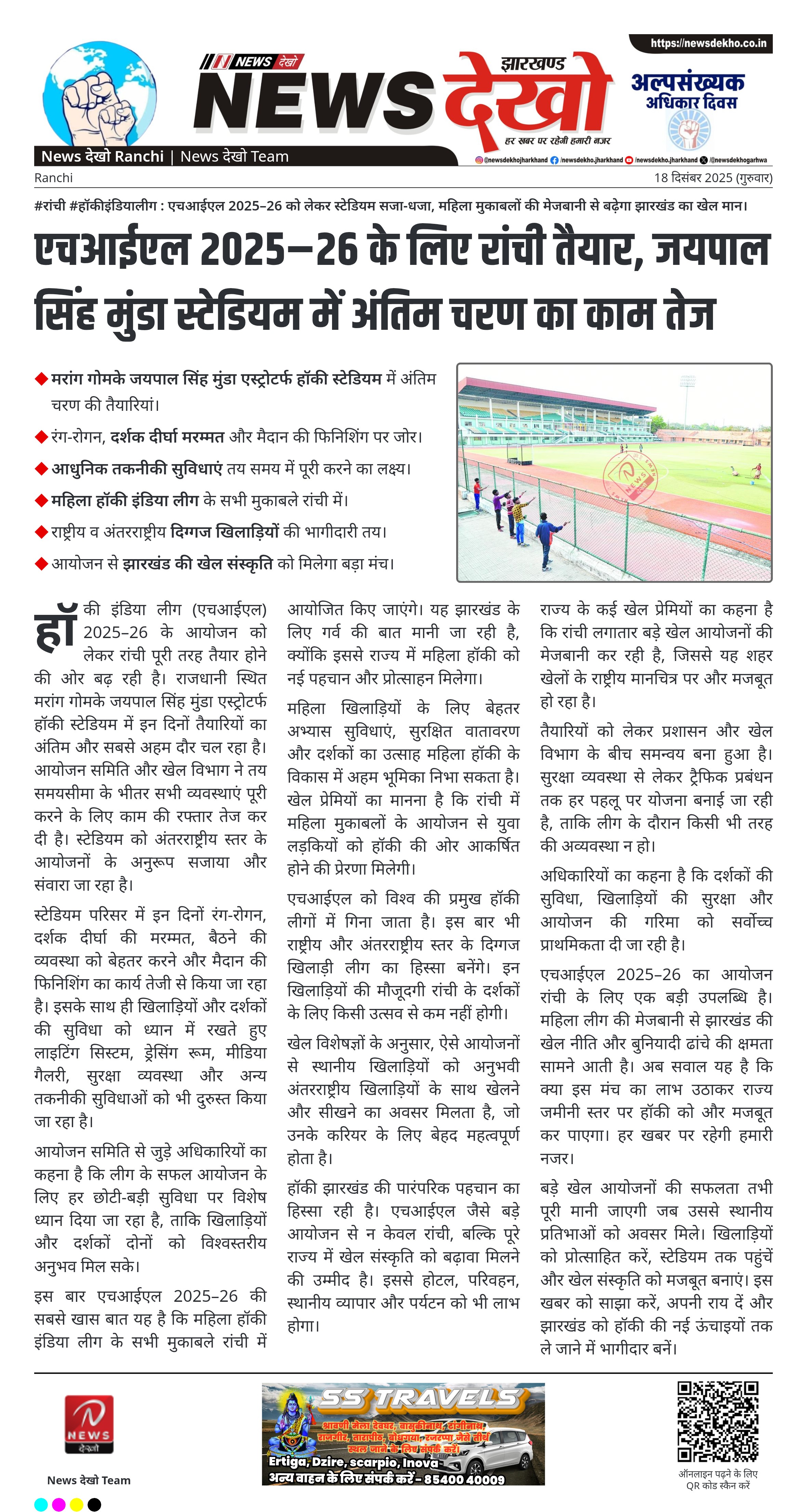 #रांची #हॉकीइंडियालीग : एचआईएल 2025–26 को लेकर स्टेडियम सजा-धजा, महिला मुकाबलों की मेजबानी से बढ़ेगा झारखंड का खेल मान। मरांग गोमके जयपाल सिंह मुंडा एस्ट्रोटर्फ हॉकी स्टेडियम में अंतिम चरण की तैयारियां। रंग-रोगन, दर्शक दीर्घा मरम्मत और मैदान की फिनिशिंग पर जोर। आधुनिक तकनीकी सुविधाएं तय समय में पूरी करने…