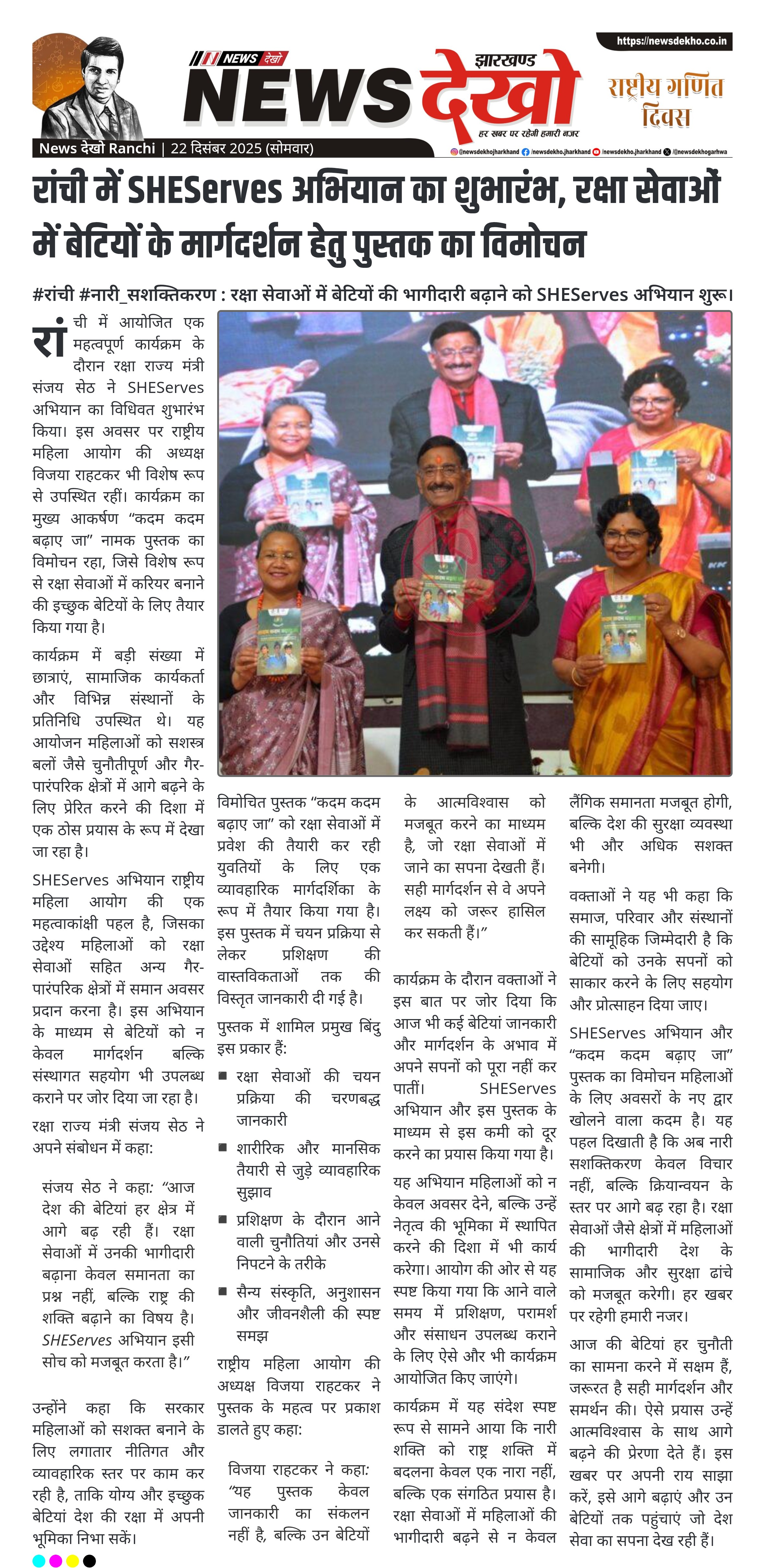 #रांची #नारी_सशक्तिकरण : रक्षा सेवाओं में बेटियों की भागीदारी बढ़ाने को SHEServes अभियान शुरू। रक्षा राज्य मंत्री संजय सेठ ने रांची में SHEServes अभियान का शुभारंभ किया। राष्ट्रीय महिला आयोग की अध्यक्ष विजया राहटकर की विशेष उपस्थिति रही। “कदम कदम बढ़ाए जा” पुस्तक का विमोचन किया गया। पुस्तक में रक्षा…