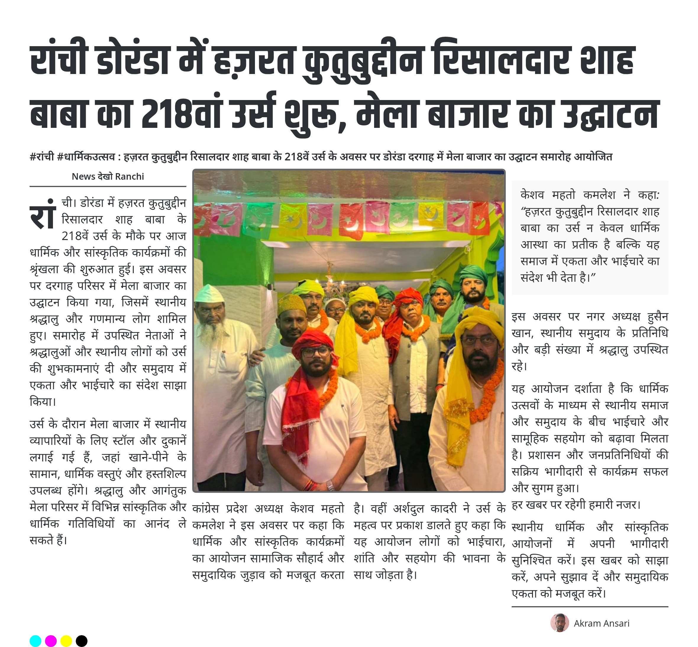 रांची डोरंडा में हज़रत कुतुबुद्दीन रिसालदार शाह बाबा का 218वां उर्स शुरू, मेला बाजार का उद्घाटन
