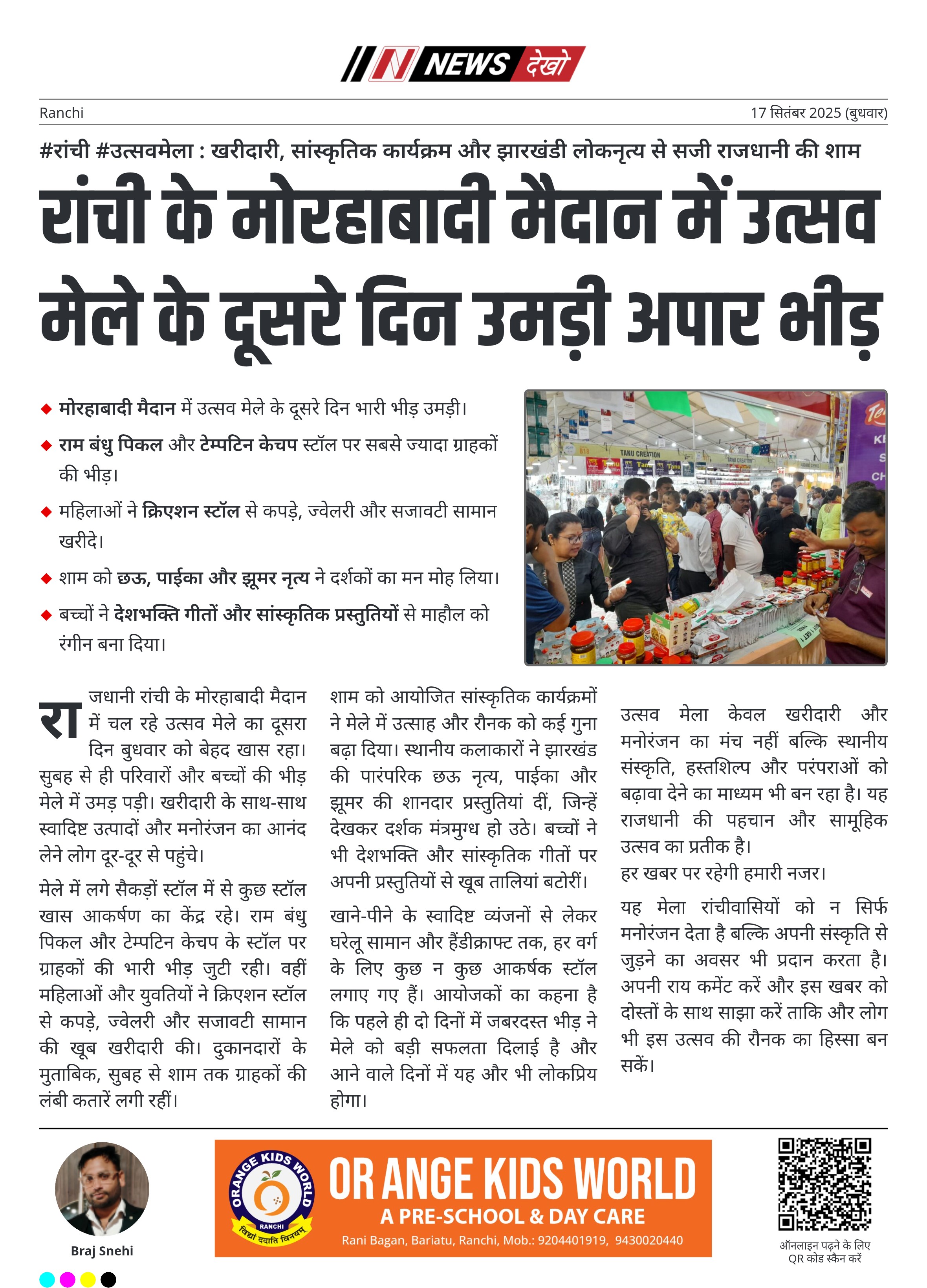 #रांची #उत्सवमेला : खरीदारी, सांस्कृतिक कार्यक्रम और झारखंडी लोकनृत्य से सजी राजधानी की शाम मोरहाबादी मैदान में उत्सव मेले के दूसरे दिन भारी भीड़ उमड़ी। राम बंधु पिकल और टेम्पटिन केचप स्टॉल पर सबसे ज्यादा ग्राहकों की भीड़। महिलाओं ने क्रिएशन स्टॉल से कपड़े, ज्वेलरी और सजावटी सामान खरीदे। शाम…
