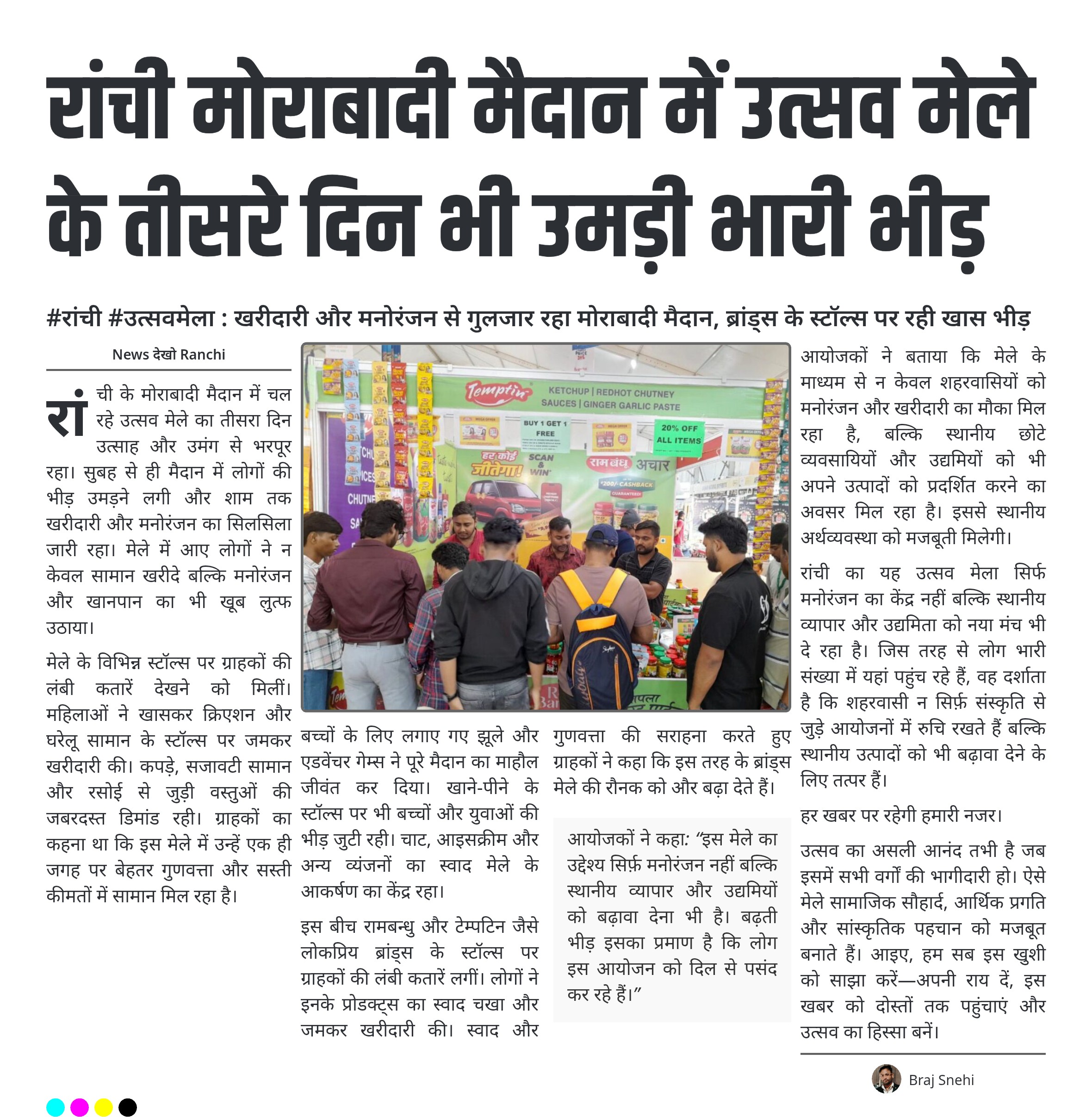 #रांची #उत्सवमेला : खरीदारी और मनोरंजन से गुलजार रहा मोराबादी मैदान, ब्रांड्स के स्टॉल्स पर रही खास भीड़ रांची मोराबादी मैदान में उत्सव मेले का तीसरा दिन बेहद खास रहा। सुबह से देर शाम तक लोगों की भारी भीड़, खरीदारी का उत्साह चरम पर। महिलाओं ने क्रिएशन और घरेलू सामान…