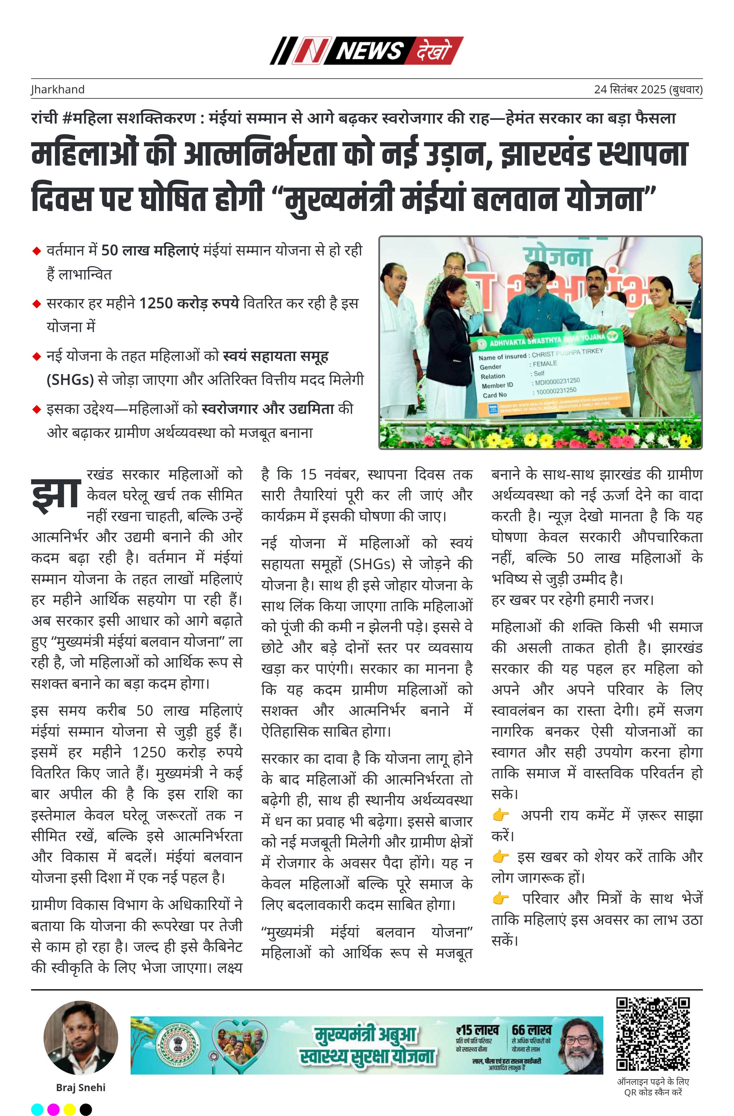 रांची #महिला सशक्तिकरण : मंईयां सम्मान से आगे बढ़कर स्वरोजगार की राह—हेमंत सरकार का बड़ा फैसला 15 नवंबर, झारखंड स्थापना दिवस पर मुख्यमंत्री हेमंत सोरेन करेंगे “मुख्यमंत्री मंईयां बलवान योजना” की घोषणा वर्तमान में 50 लाख महिलाएं मंईयां सम्मान योजना से हो रही हैं लाभान्वित सरकार हर महीने 1250 करोड़…