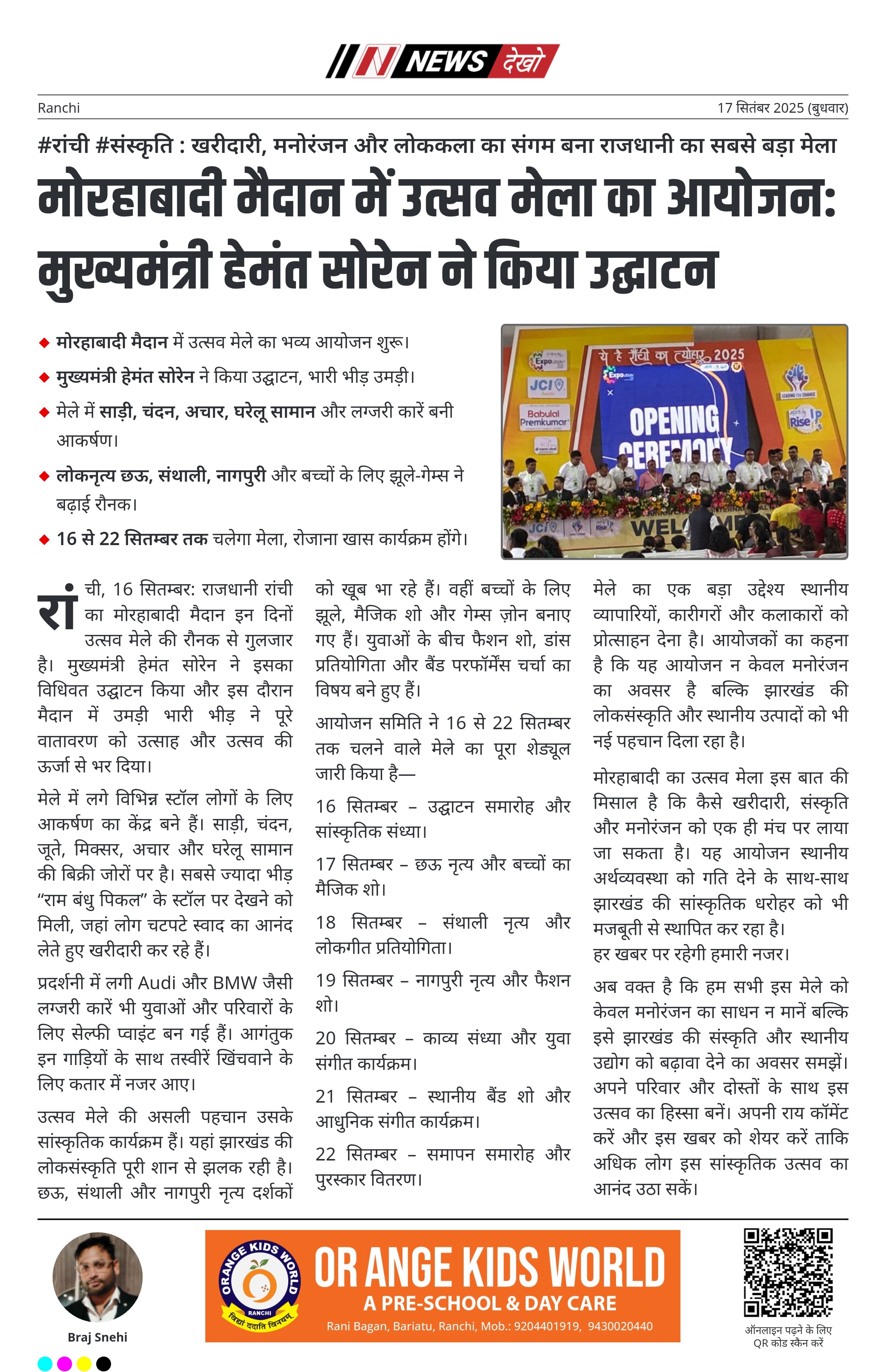 #रांची #संस्कृति : खरीदारी, मनोरंजन और लोककला का संगम बना राजधानी का सबसे बड़ा मेला मोरहाबादी मैदान में उत्सव मेले का भव्य आयोजन शुरू। मुख्यमंत्री हेमंत सोरेन ने किया उद्घाटन, भारी भीड़ उमड़ी। मेले में साड़ी, चंदन, अचार, घरेलू सामान और लग्जरी कारें बनी आकर्षण। लोकनृत्य छऊ, संथाली, नागपुरी और…