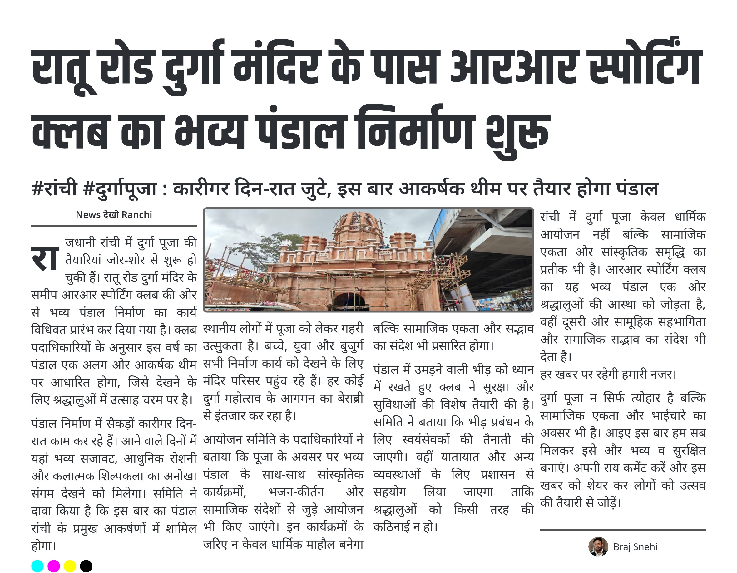 रातू रोड दुर्गा मंदिर के पास आरआर स्पोर्टिंग क्लब का भव्य पंडाल निर्माण शुरू