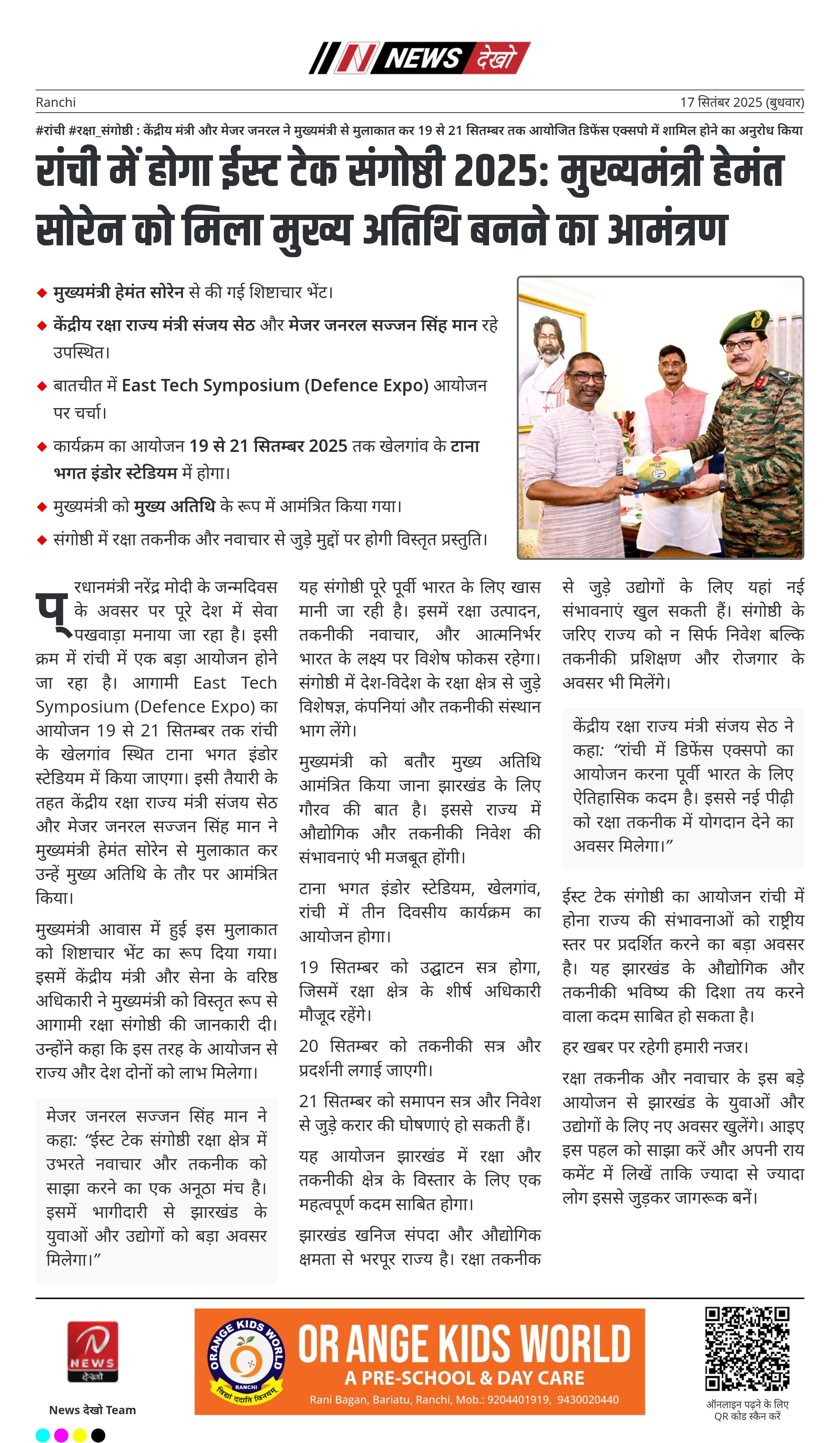 #रांची #रक्षा_संगोष्ठी : केंद्रीय मंत्री और मेजर जनरल ने मुख्यमंत्री से मुलाकात कर 19 से 21 सितम्बर तक आयोजित डिफेंस एक्सपो में शामिल होने का अनुरोध किया मुख्यमंत्री हेमंत सोरेन से की गई शिष्टाचार भेंट। केंद्रीय रक्षा राज्य मंत्री संजय सेठ और मेजर जनरल सज्जन सिंह मान रहे उपस्थित। बातचीत…