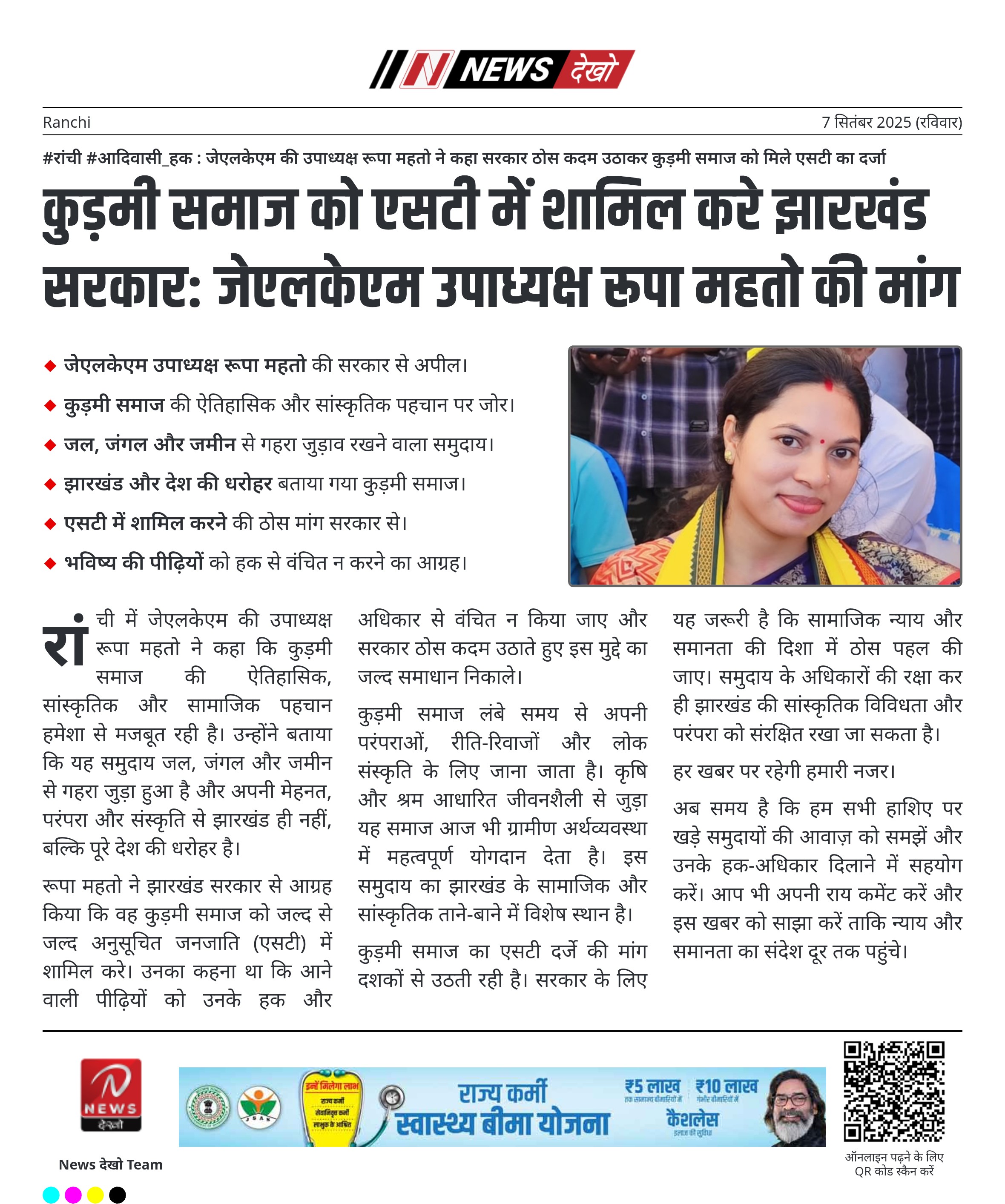#रांची #आदिवासी_हक : जेएलकेएम की उपाध्यक्ष रूपा महतो ने कहा सरकार ठोस कदम उठाकर कुड़मी समाज को मिले एसटी का दर्जा जेएलकेएम उपाध्यक्ष रूपा महतो की सरकार से अपील। कुड़मी समाज की ऐतिहासिक और सांस्कृतिक पहचान पर जोर। जल, जंगल और जमीन से गहरा जुड़ाव रखने वाला समुदाय। झारखंड और…