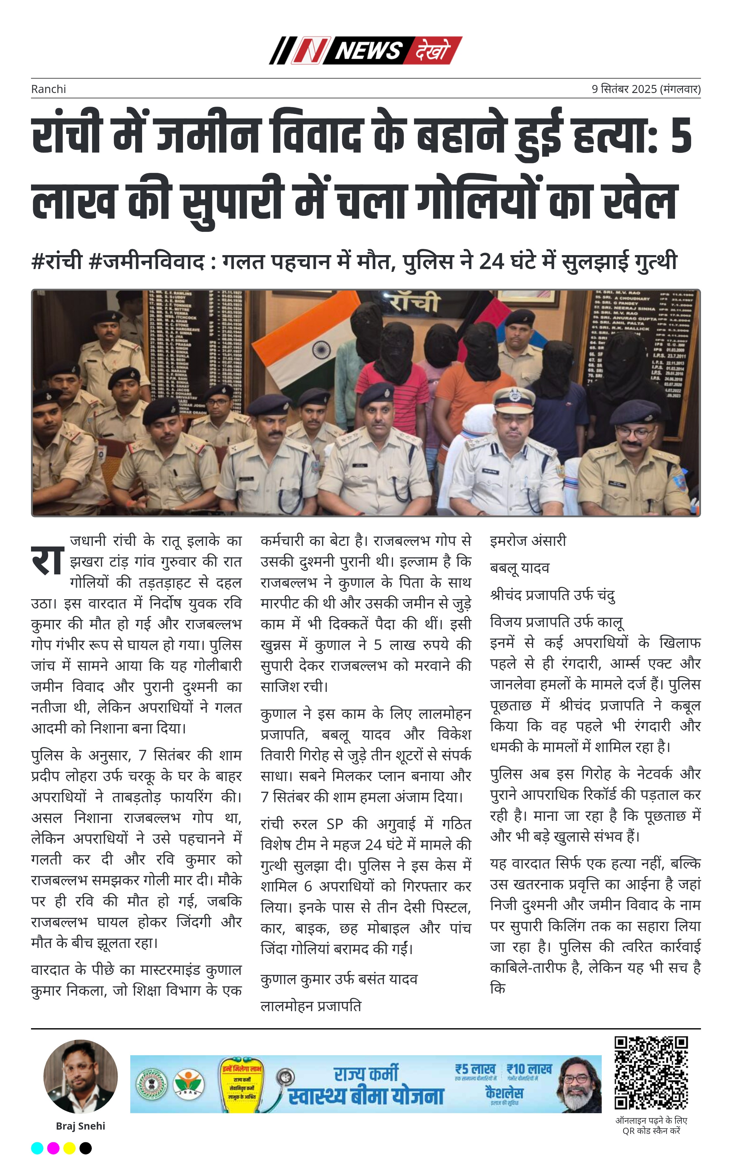 #रांची #जमीनविवाद : गलत पहचान में मौत, पुलिस ने 24 घंटे में सुलझाई गुत्थी रांची के रातू इलाके में जमीन विवाद को लेकर हुई गोलीबारी का पर्दाफाश। गलत पहचान में रवि कुमार की मौत, राजबल्लभ गोप घायल। मुख्य साजिशकर्ता कुणाल कुमार ने 5 लाख की सुपारी देकर रची थी साजिश।…