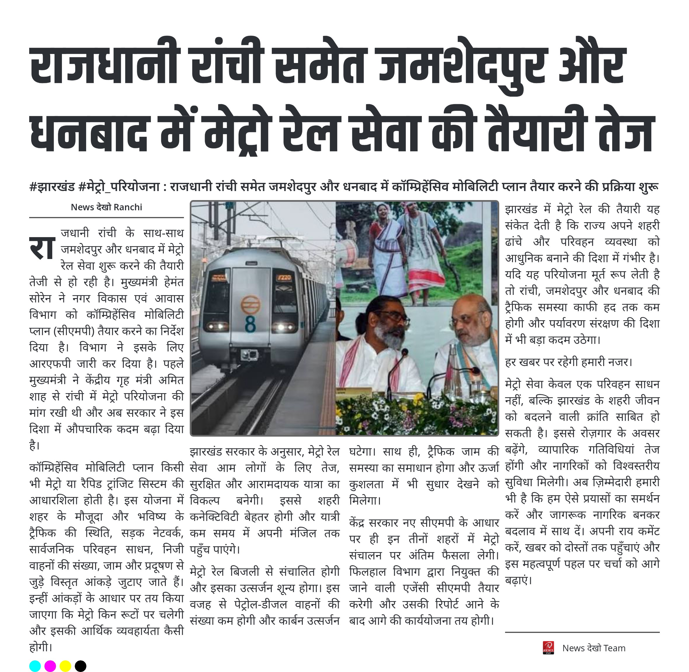 राजधानी रांची समेत जमशेदपुर और धनबाद में मेट्रो रेल सेवा की तैयारी तेज