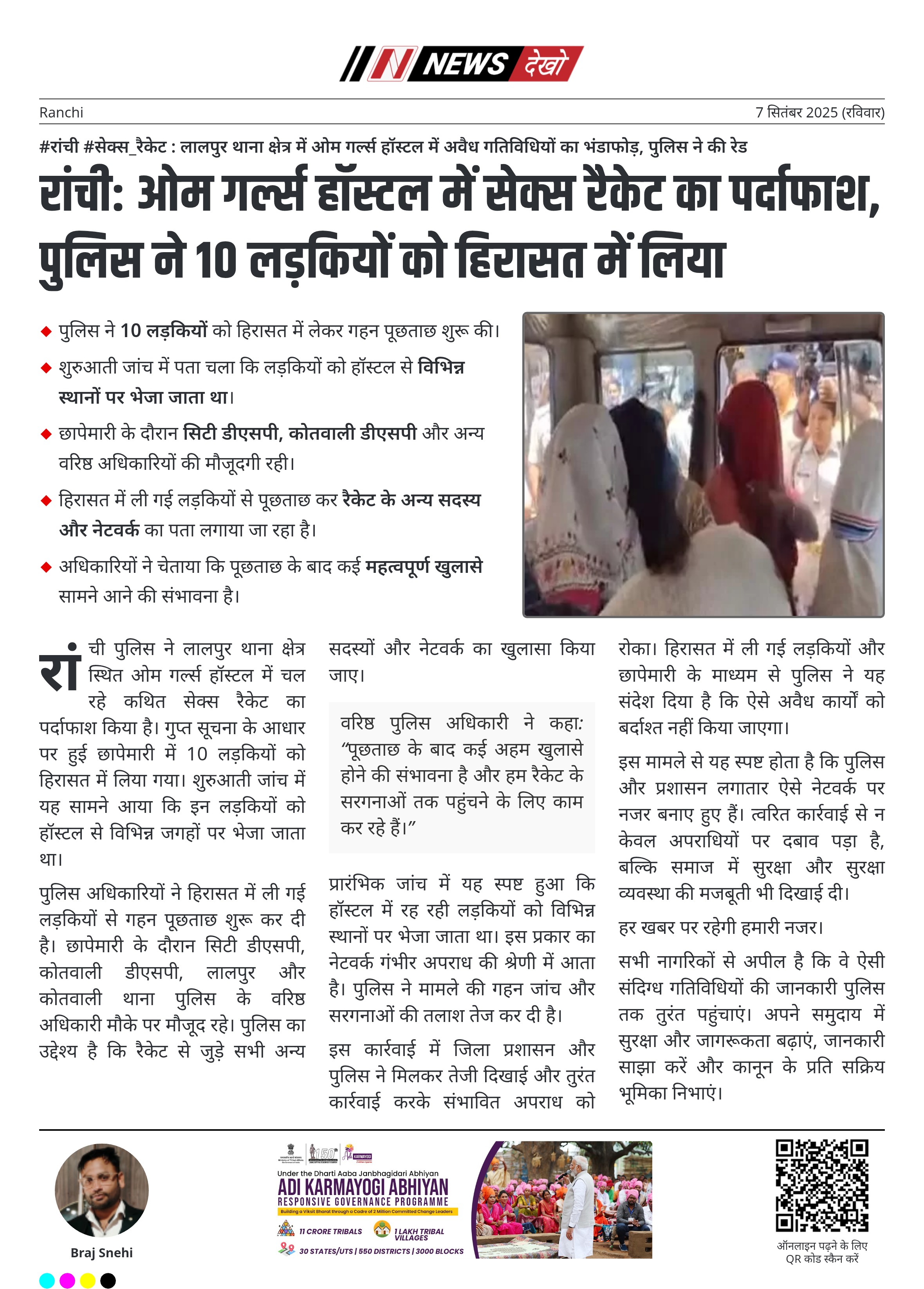 #रांची #सेक्स_रैकेट : लालपुर थाना क्षेत्र में ओम गर्ल्स हॉस्टल में अवैध गतिविधियों का भंडाफोड़, पुलिस ने की रेड रांची पुलिस ने लालपुर थाना क्षेत्र के ओम गर्ल्स हॉस्टल में चल रहे सेक्स रैकेट का खुलासा किया। पुलिस ने 10 लड़कियों को हिरासत में लेकर गहन पूछताछ शुरू की। शुरुआती…