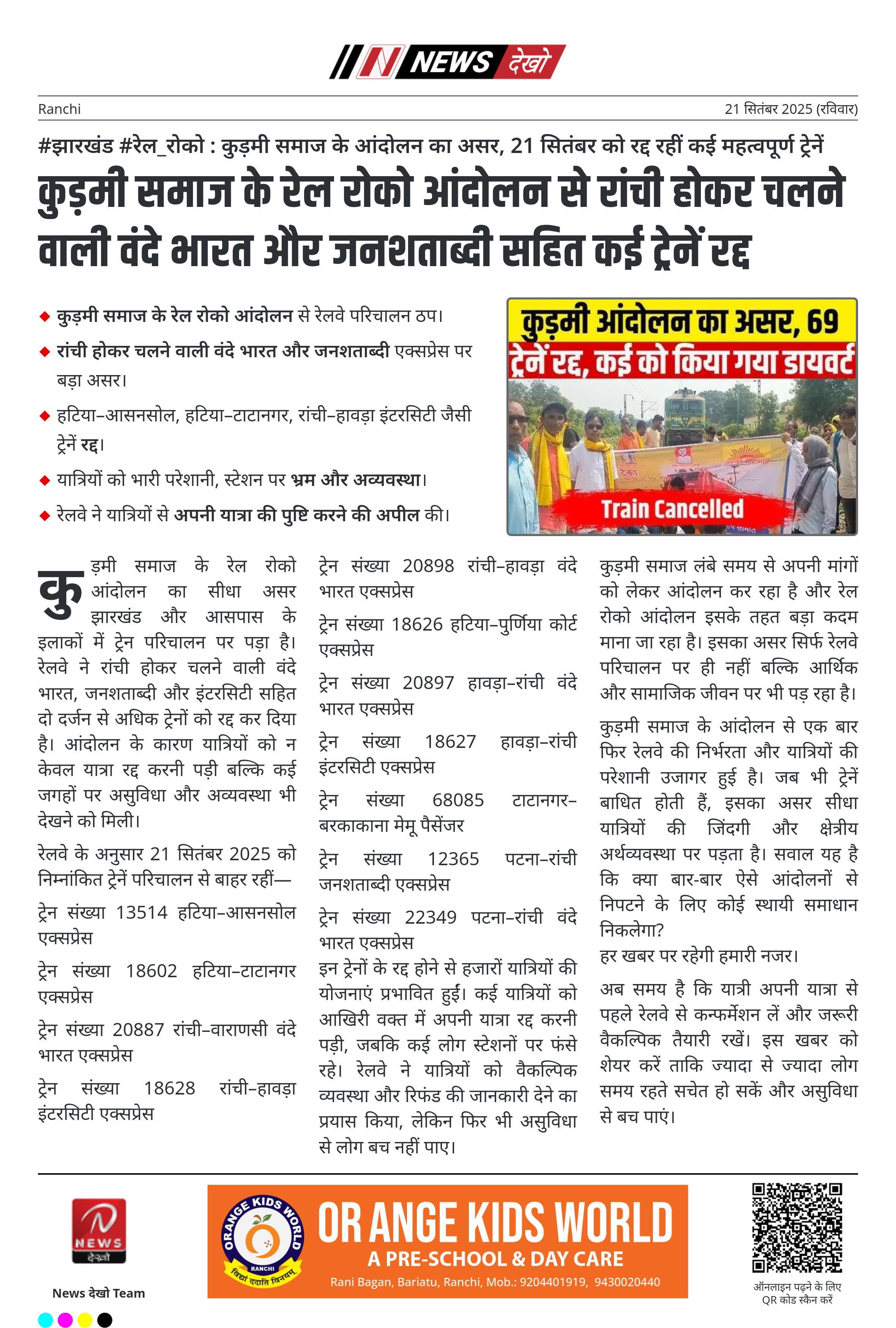 #झारखंड #रेल_रोको : कुड़मी समाज के आंदोलन का असर, 21 सितंबर को रद्द रहीं कई महत्वपूर्ण ट्रेनें कुड़मी समाज के रेल रोको आंदोलन से रेलवे परिचालन ठप। रांची होकर चलने वाली वंदे भारत और जनशताब्दी एक्सप्रेस पर बड़ा असर। हटिया–आसनसोल, हटिया–टाटानगर, रांची–हावड़ा इंटरसिटी जैसी ट्रेनें रद्द। यात्रियों को भारी परेशानी,…