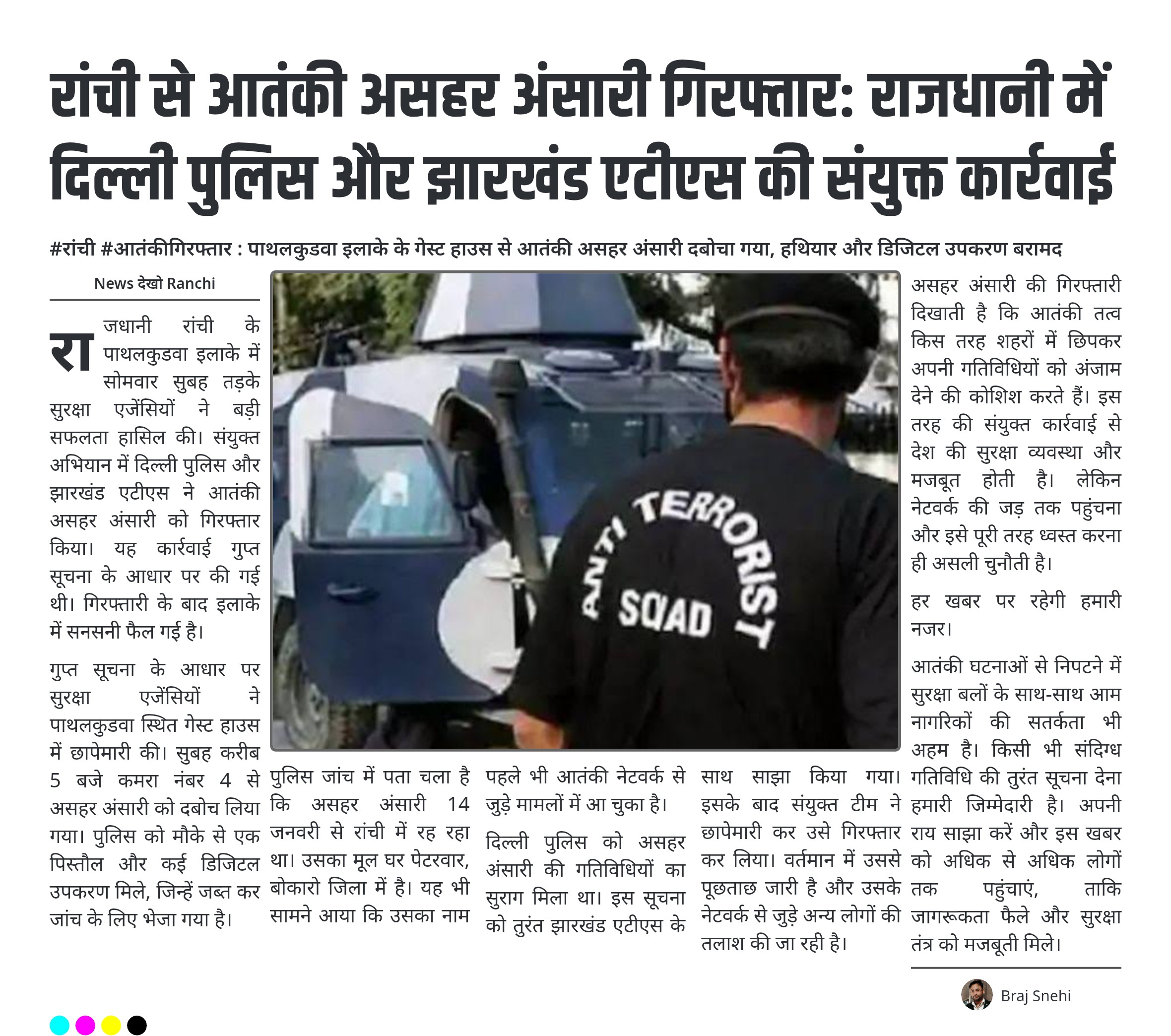 रांची से आतंकी असहर अंसारी गिरफ्तार: राजधानी में दिल्ली पुलिस और झारखंड एटीएस की संयुक्त कार्रवाई