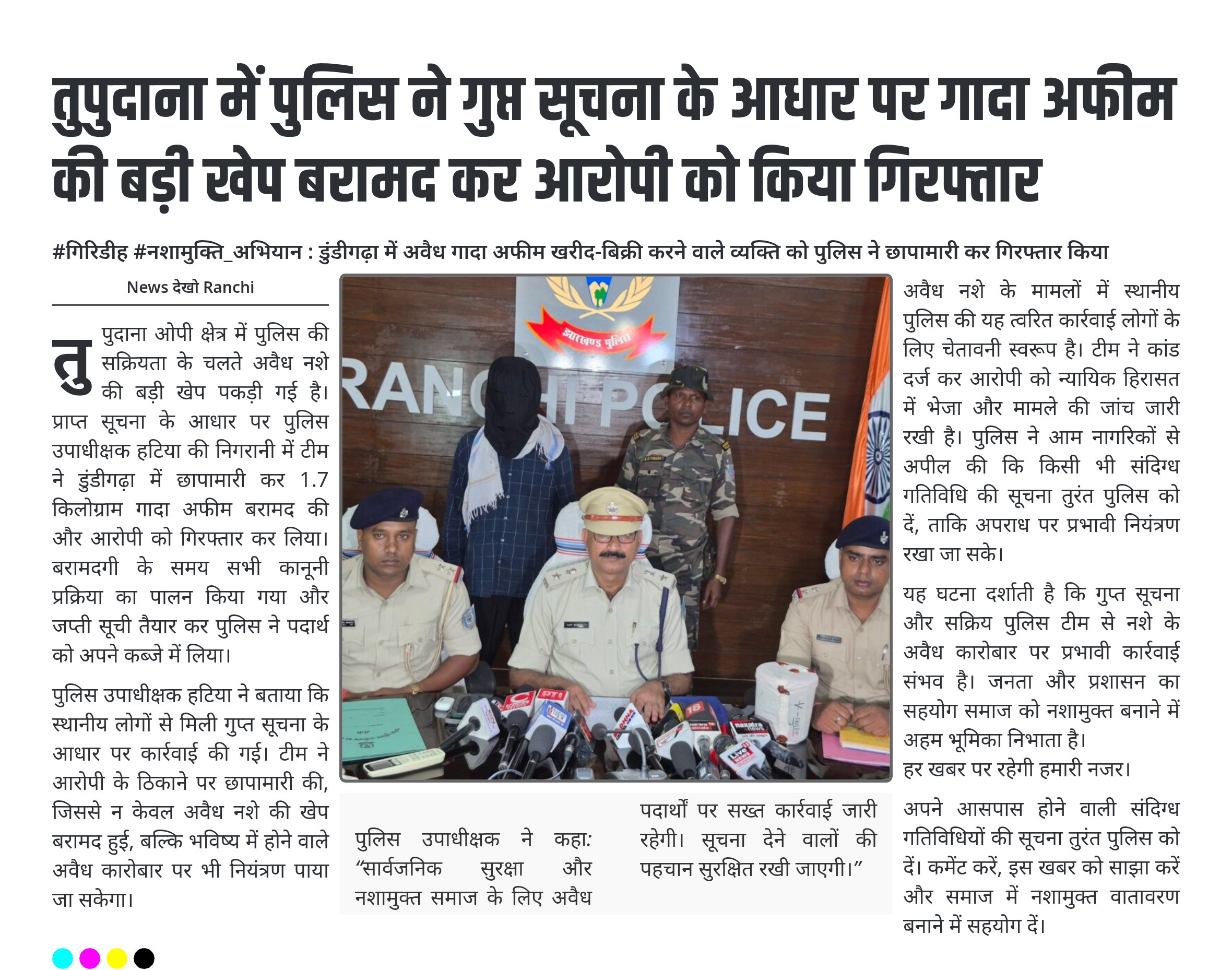 #गिरिडीह #नशामुक्ति_अभियान : डुंडीगढ़ा में अवैध गादा अफीम खरीद-बिक्री करने वाले व्यक्ति को पुलिस ने छापामारी कर गिरफ्तार किया दिनांक 06.09.2025, सुबह लगभग 11:00 बजे, तुपुदाना ओपी क्षेत्र में गुप्त सूचना मिली कि एक व्यक्ति अवैध रूप से गादा अफीम का कारोबार कर रहा है। सूचना के आधार पर पुलिस…