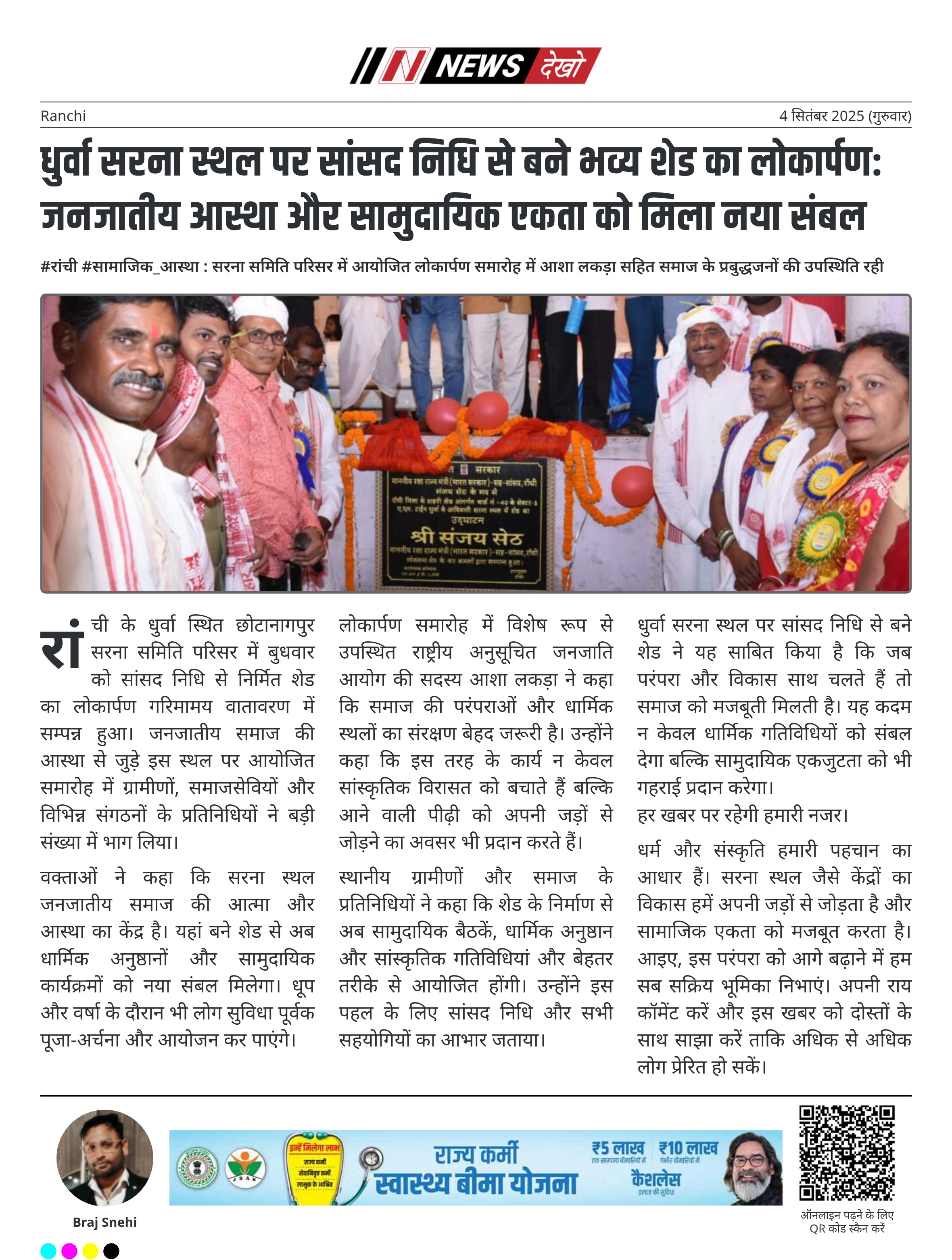 धुर्वा सरना स्थल पर सांसद निधि से बने भव्य शेड का लोकार्पण: जनजातीय आस्था और सामुदायिक एकता को मिला नया संबल