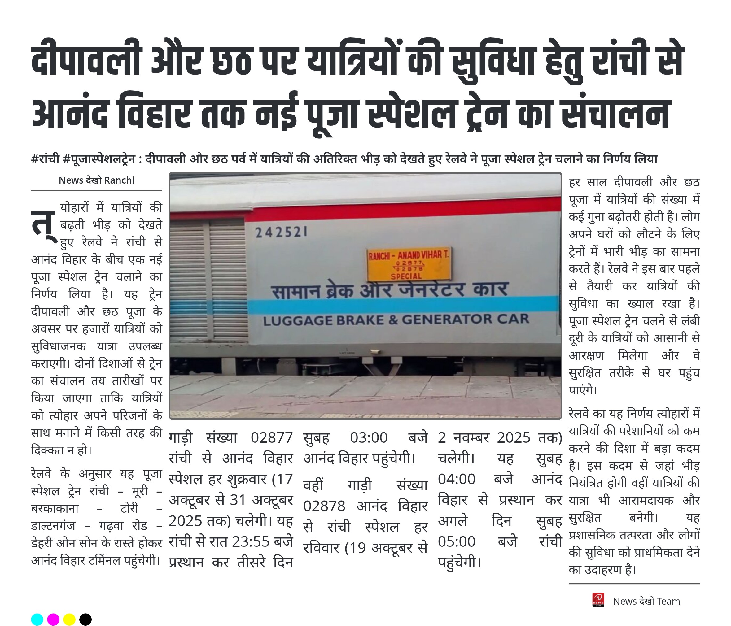 दीपावली और छठ पर यात्रियों की सुविधा हेतु रांची से आनंद विहार तक नई पूजा स्पेशल ट्रेन का संचालन