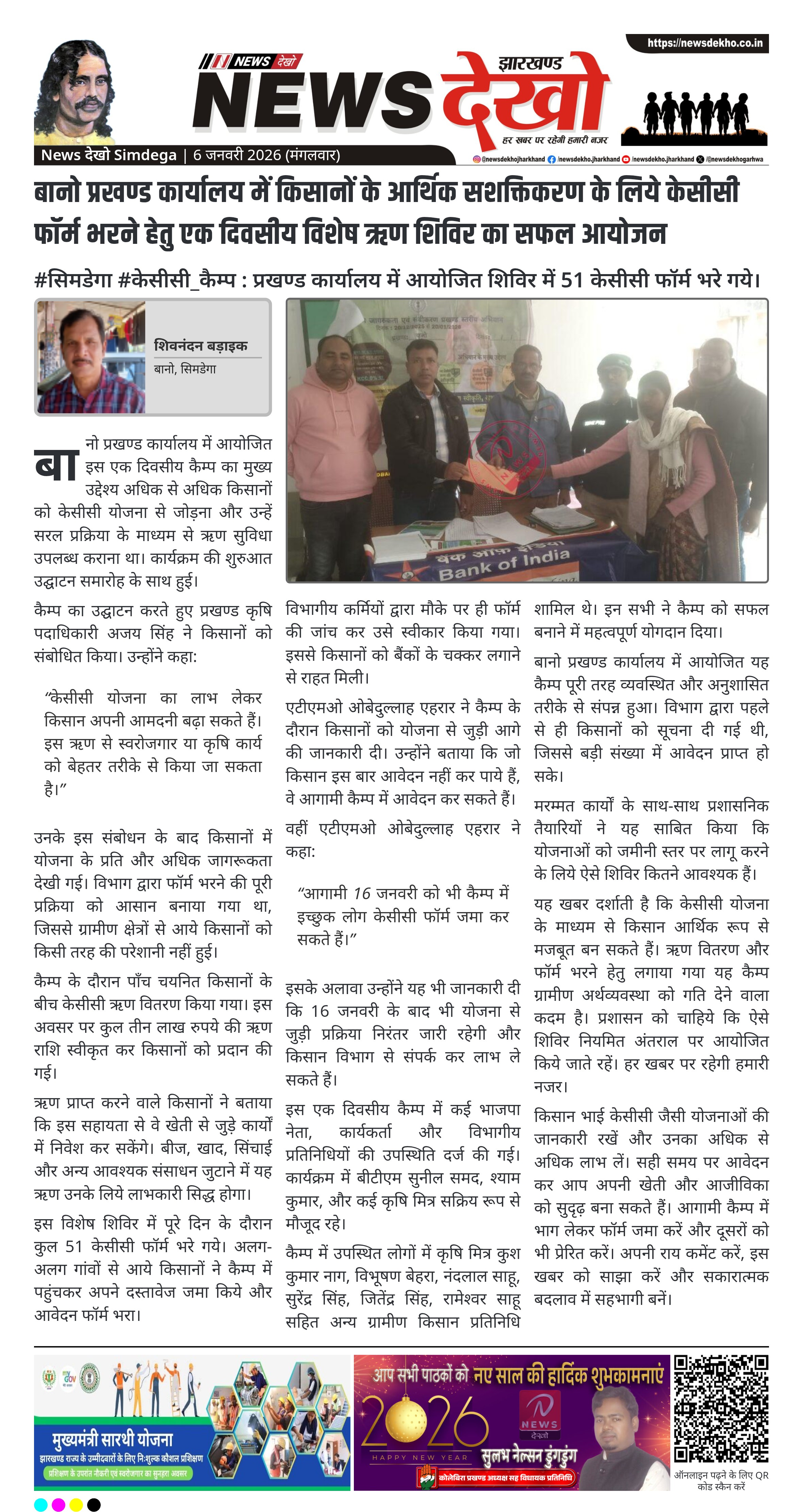 #सिमडेगा #केसीसी_कैम्प : प्रखण्ड कार्यालय में आयोजित शिविर में 51 केसीसी फॉर्म भरे गये। मंगलवार को बानो प्रखण्ड कार्यालय परिसर में कैम्प का आयोजन। कैम्प का उद्घाटन प्रखण्ड कृषि पदाधिकारी अजय सिंह ने किया। पाँच किसानों के बीच कुल तीन लाख रुपये केसीसी ऋण का वितरण। शिविर में कुल 51…