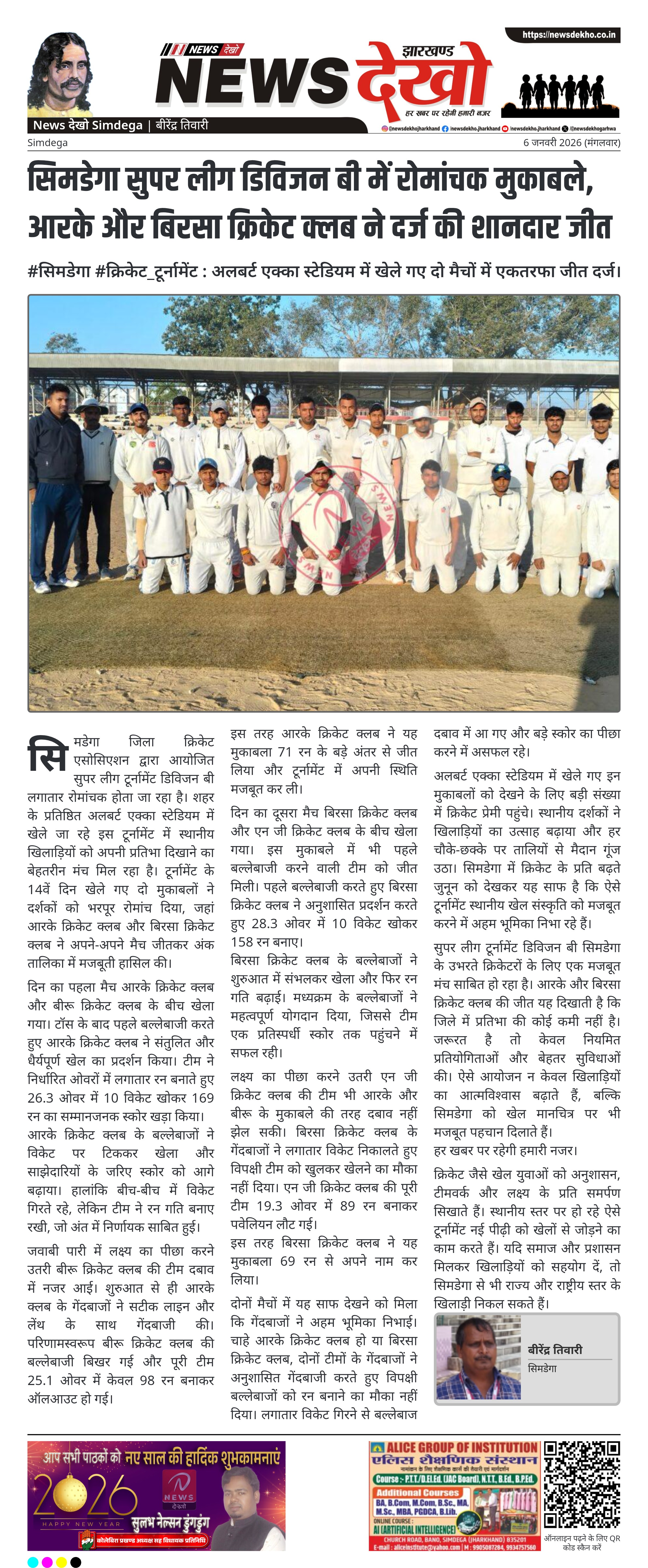 सिमडेगा सुपर लीग डिविजन बी में रोमांचक मुकाबले, आरके और बिरसा क्रिकेट क्लब ने दर्ज की शानदार जीत
