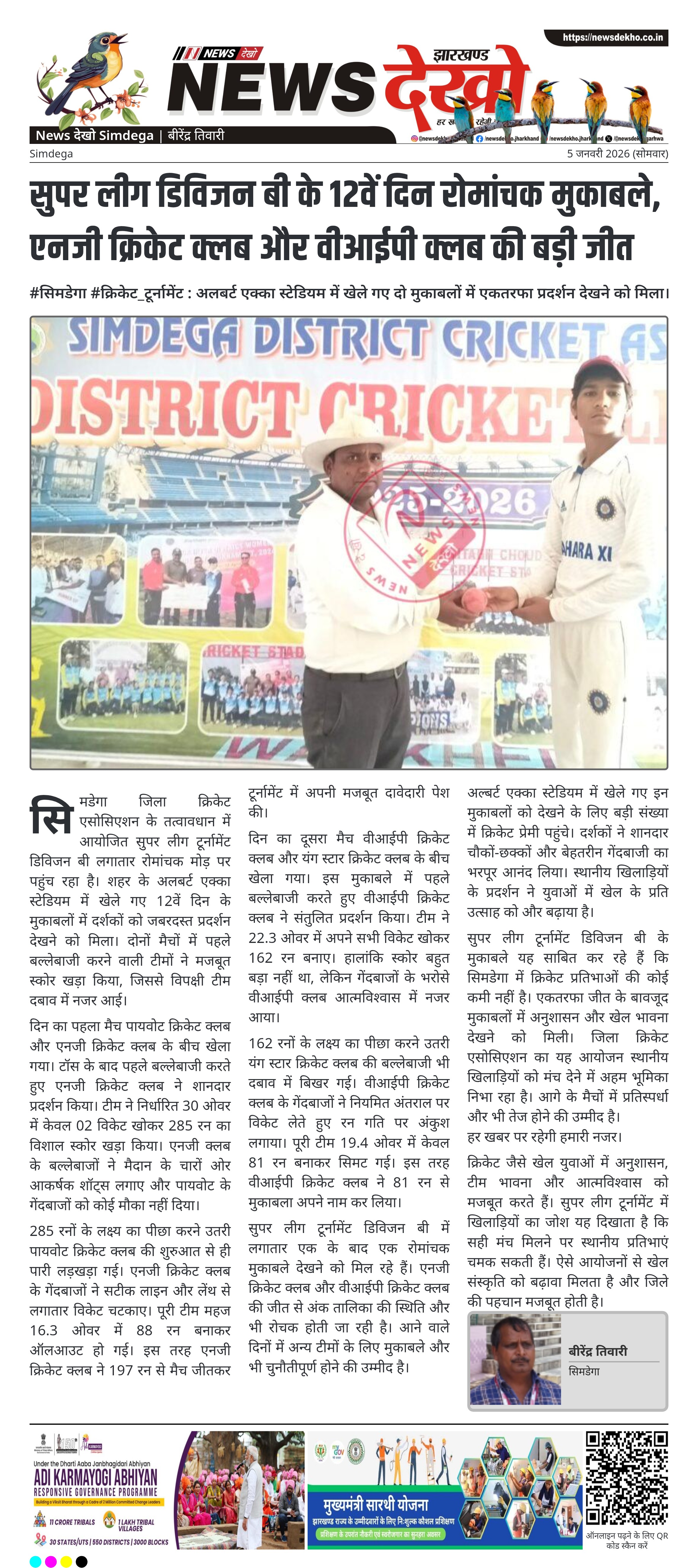 सुपर लीग डिविजन बी के 12वें दिन रोमांचक मुकाबले, एनजी क्रिकेट क्लब और वीआईपी क्लब की बड़ी जीत