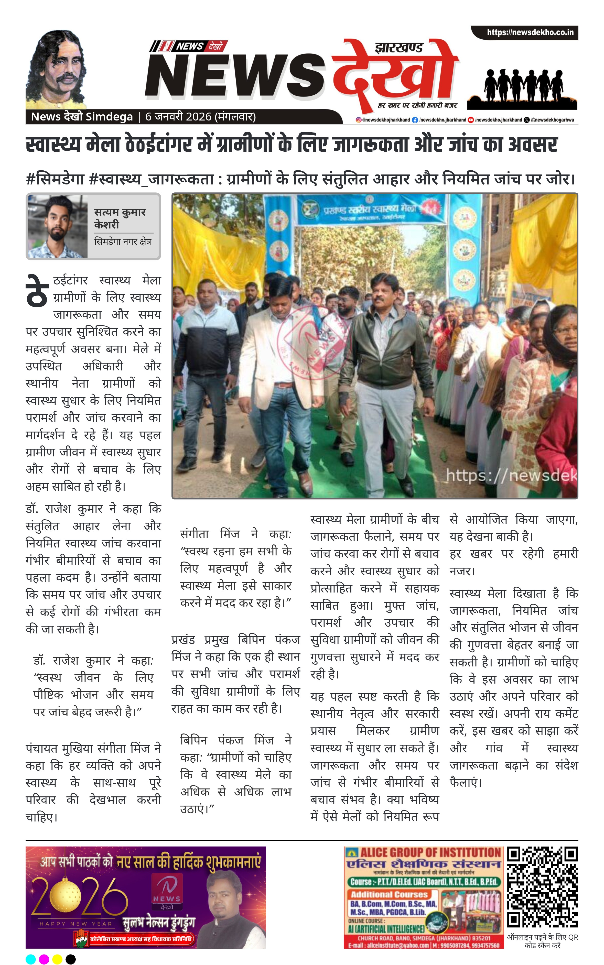 #सिमडेगा #स्वास्थ्य_जागरूकता : ग्रामीणों के लिए संतुलित आहार और नियमित जांच पर जोर। ठेठईटांगर प्रखंड में 6-10 जनवरी 2026 तक स्वास्थ्य मेला आयोजित। एमओआईसी डॉ. राजेश कुमार ने पौष्टिक आहार और समय पर जांच का महत्व बताया। पंचायत मुखिया संगीता मिंज ने परिवार सहित स्वास्थ्य पर ध्यान देने की अपील…