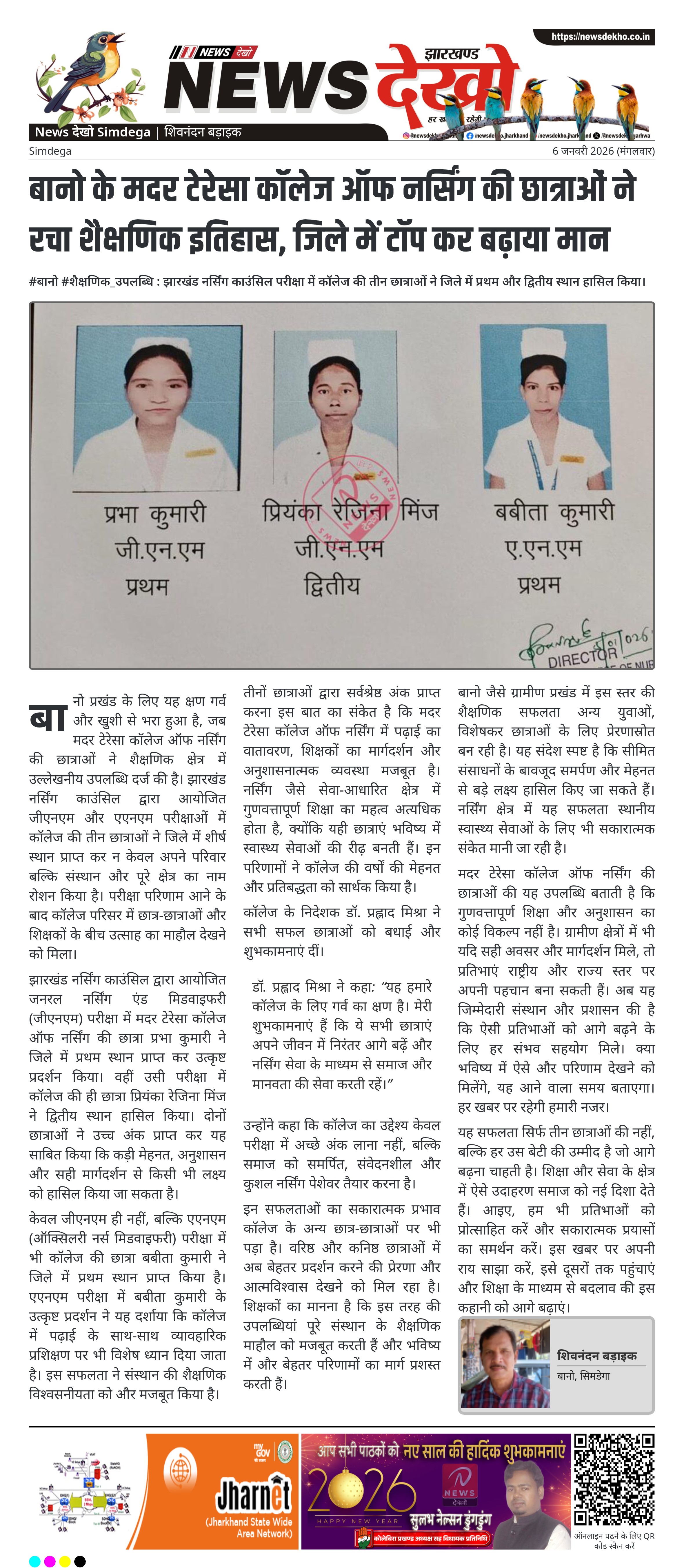 #बानो #शैक्षणिक_उपलब्धि : झारखंड नर्सिंग काउंसिल परीक्षा में कॉलेज की तीन छात्राओं ने जिले में प्रथम और द्वितीय स्थान हासिल किया। मदर टेरेसा कॉलेज ऑफ नर्सिंग, बानो की छात्राओं का उत्कृष्ट प्रदर्शन। जीएनएम परीक्षा में प्रभा कुमारी ने जिला प्रथम स्थान प्राप्त किया। प्रियंका रेजिना मिंज को जीएनएम परीक्षा में…