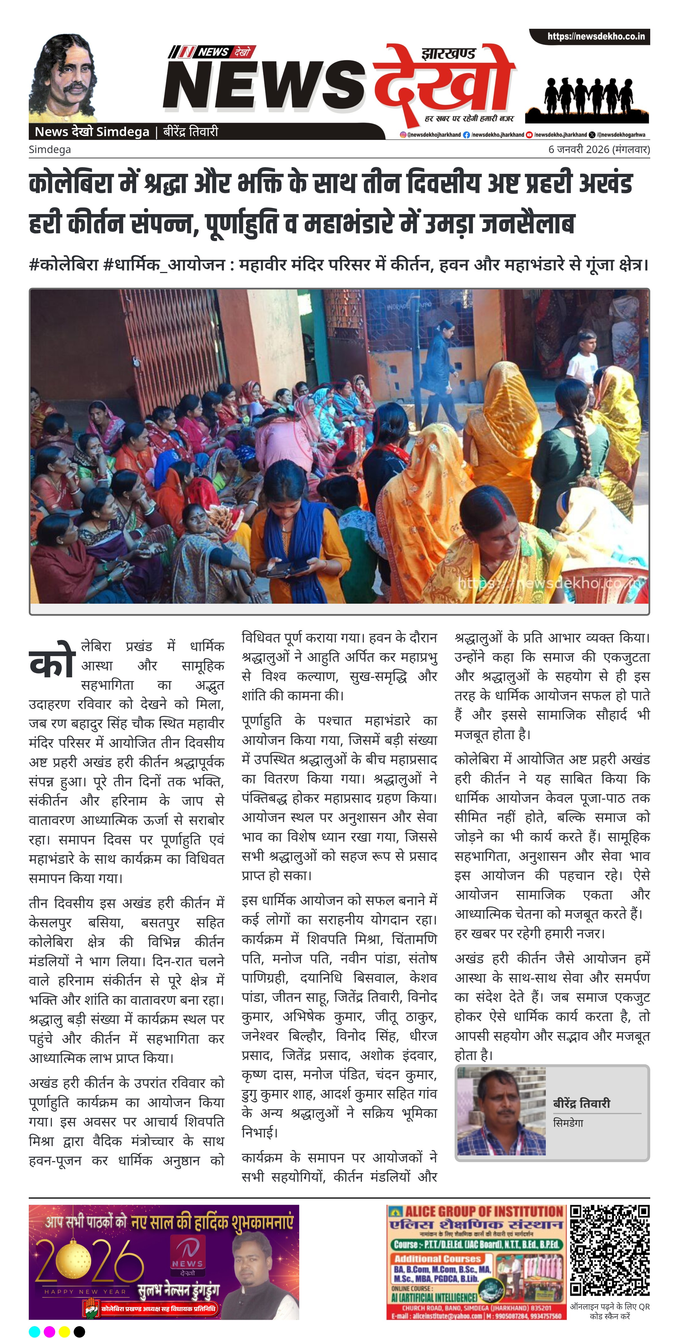 #कोलेबिरा #धार्मिक_आयोजन : महावीर मंदिर परिसर में कीर्तन, हवन और महाभंडारे से गूंजा क्षेत्र। महावीर मंदिर परिसर, कोलेबिरा में तीन दिवसीय आयोजन। केसलपुर बसिया, बसतपुर सहित कई कीर्तन मंडलियों की सहभागिता। आचार्य शिवपति मिश्रा द्वारा वैदिक मंत्रोच्चार के साथ पूर्णाहुति। पूर्णाहुति के बाद महाभंडारे में महाप्रसाद वितरण। आयोजन को सफल…
