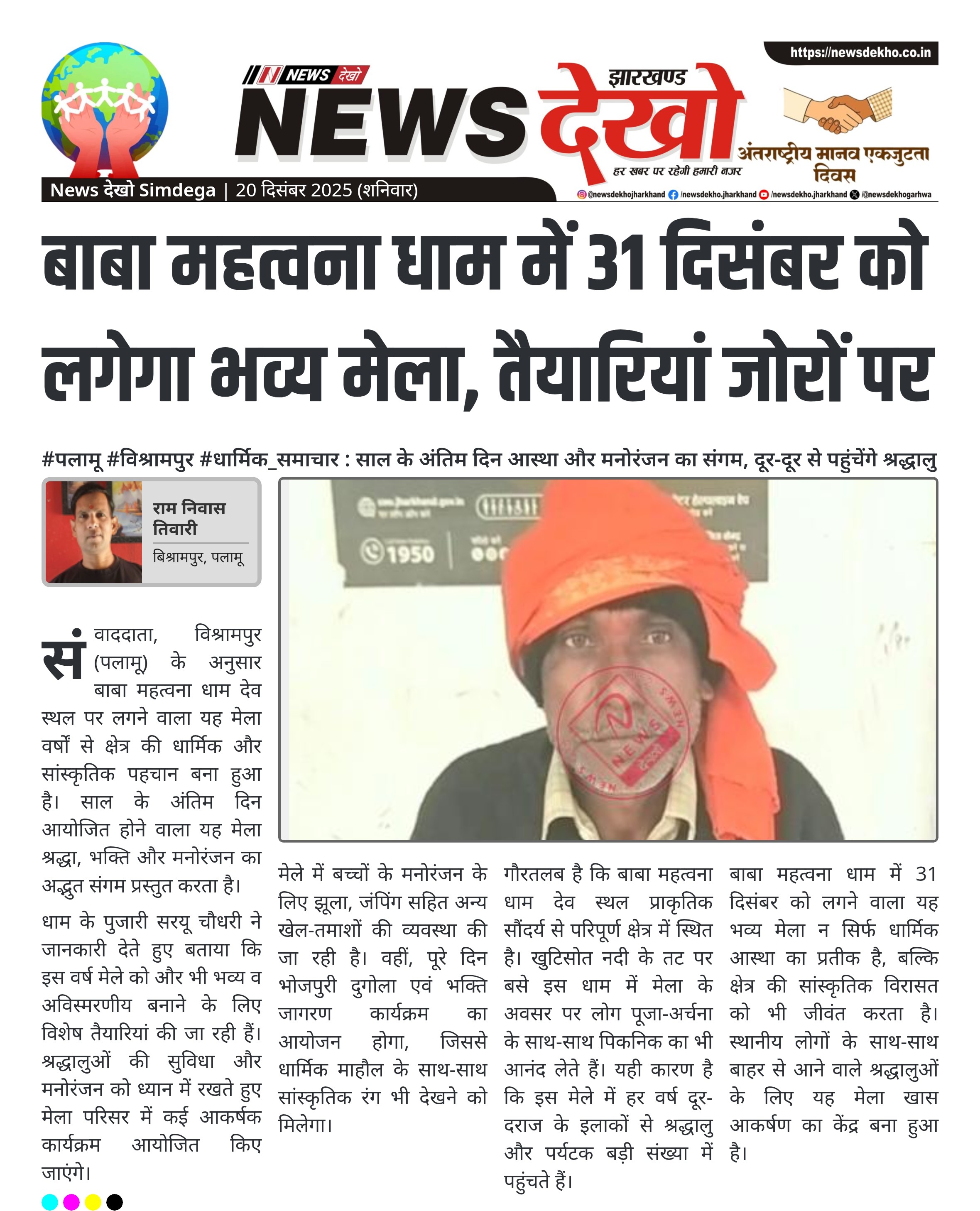 #पलामू #विश्रामपुर #धार्मिक_समाचार : साल के अंतिम दिन आस्था और मनोरंजन का संगम, दूर-दूर से पहुंचेंगे श्रद्धालु। 31 दिसंबर को बाबा महत्वना धाम में भव्य मेला खुटिसोत नदी तट पर स्थित है प्रसिद्ध देव स्थल बच्चों के मनोरंजन के लिए झूला, जंपिंग सहित कई आकर्षण भोजपुरी दुगोला और भक्ति जागरण…
