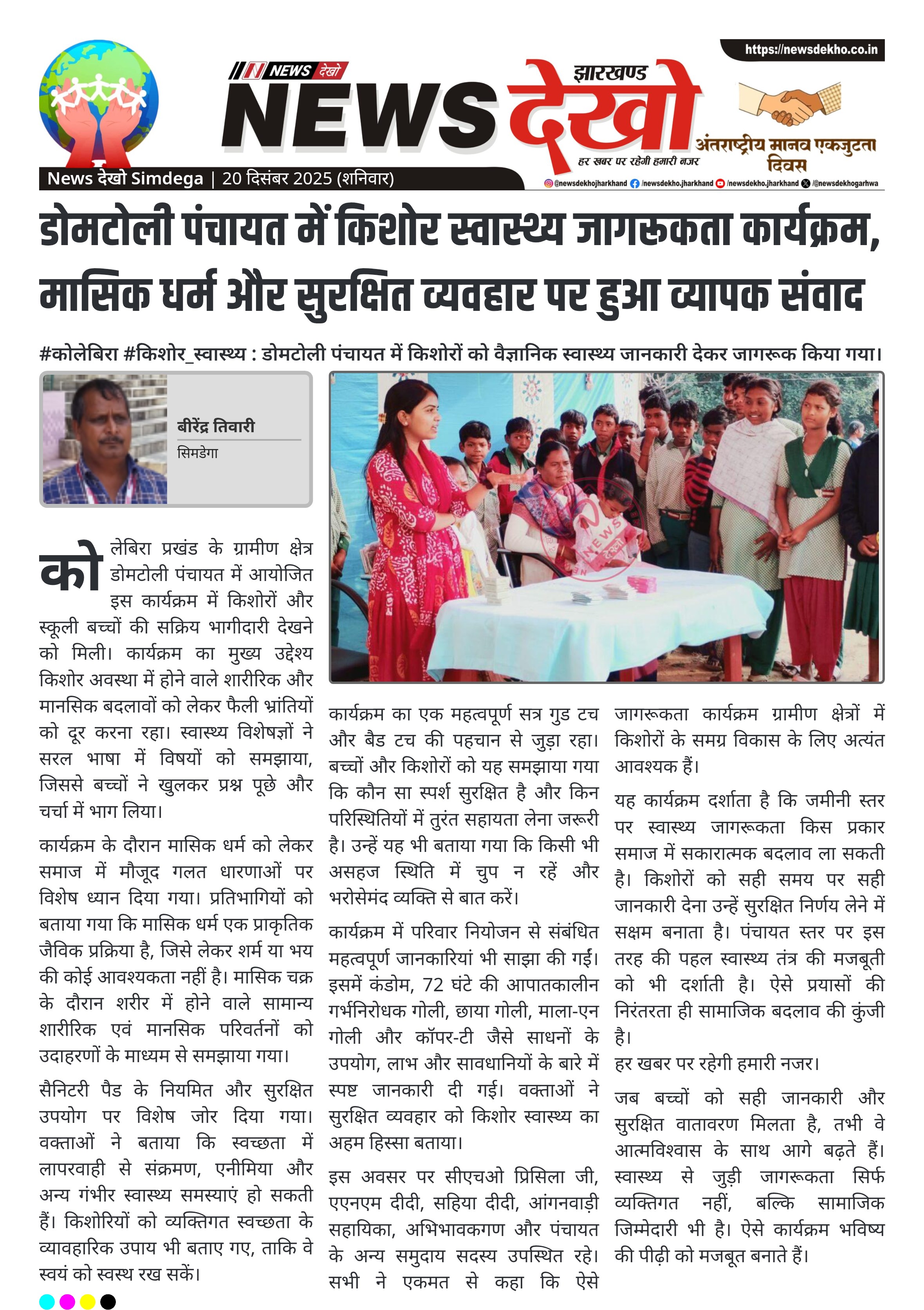 #कोलेबिरा #किशोर_स्वास्थ्य : डोमटोली पंचायत में किशोरों को वैज्ञानिक स्वास्थ्य जानकारी देकर जागरूक किया गया। डोमटोली पंचायत में किशोर स्वास्थ्य जागरूकता कार्यक्रम का आयोजन। पिरामल फाउंडेशन की प्रतिनिधि रविना मालवीय ने किया कार्यक्रम संचालन। मुखिया अनीता जड़िया की रही गरिमामयी उपस्थिति। मासिक धर्म, स्वच्छता और मानसिक बदलावों पर दी गई…